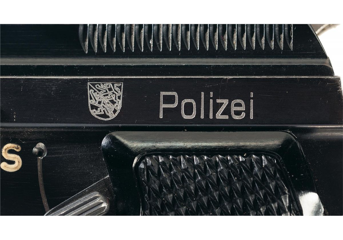 Released in 1949, the P-210 was a top of the line police and military sidearm through the 1970s, having a level of fit more in line with a top-rate target pistol than a government-issued sidearm, commanding a reputation as a high quality pistol to this day. Fixed sights, with the "Swiss cross in shield" on top of the slide, "SIG" in an oval on the left, matching numbers on the barrel, slide and frame, and "Polizei" engraved on the left side rail behind the coat of arms of Thurgau, a Northeastern Canton of Switzerland. Fitted with a smooth trigger, serrated slide catch, safety and hammer, and checkered and grooved wraparound grips with a lanyard staple and a bottom-mounted magazine catch. With a blue box marked "SIG" in gold.