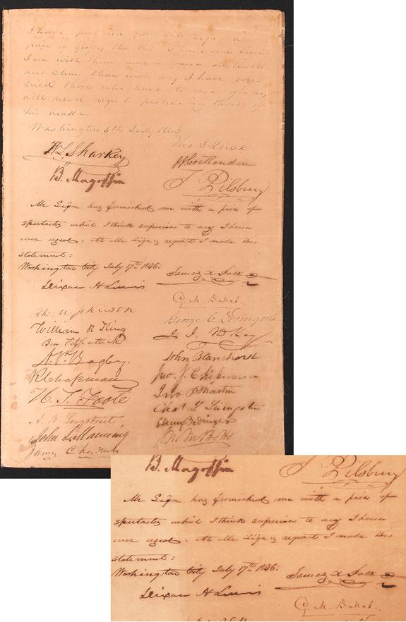 Polk, James K. Autograph endorsement signed as President, 1 page plus integral blank leaf, 12½ x 7¾", Washington City, July 17, 1846. President Polk writes an endorsement in the middle of the page: "Mr. Siga has furnished me with a pair of spectacles which I think superior to any I have ever used. At Mr. Siga's request I make this statement." Texas senator Thomas J. Rusk, who played an important role in the annexation of Texas and served as president of the commission which drew up that state's constitution, wrote a testimonial above Polk's. There are over 20 other signatures endorsing Siga, including Polk's Vice President, G. M. Dallas, future Vice President William R. King (under Franklin Pierce), and other politicians, such as J.J. Crittenden, Benjamin Fitzpatrick, and Charles L. Livingston. A. B. Longstreet, author of Georgia's first important literary work, also signed. Paper is toned brown, silked from verso and has a couple of tiny holes from ink corrosion. A most unusual presidential document.