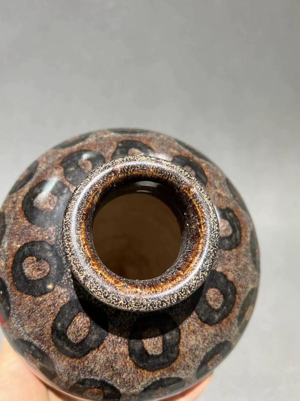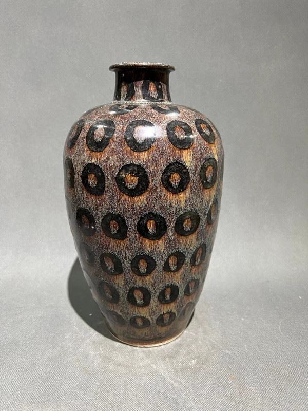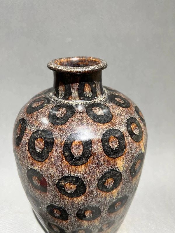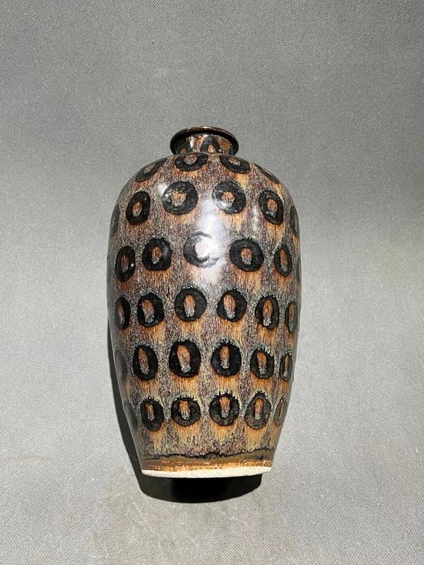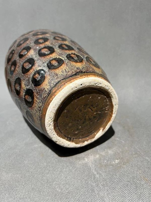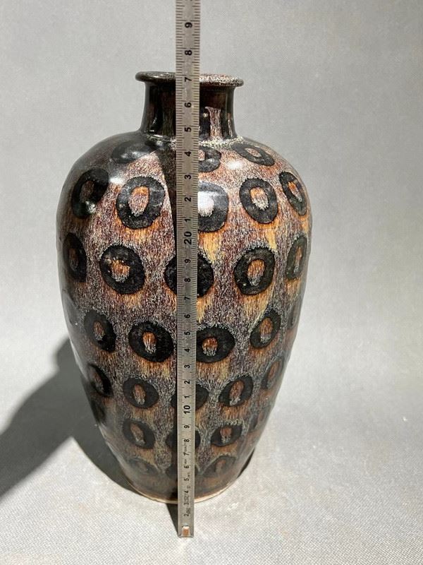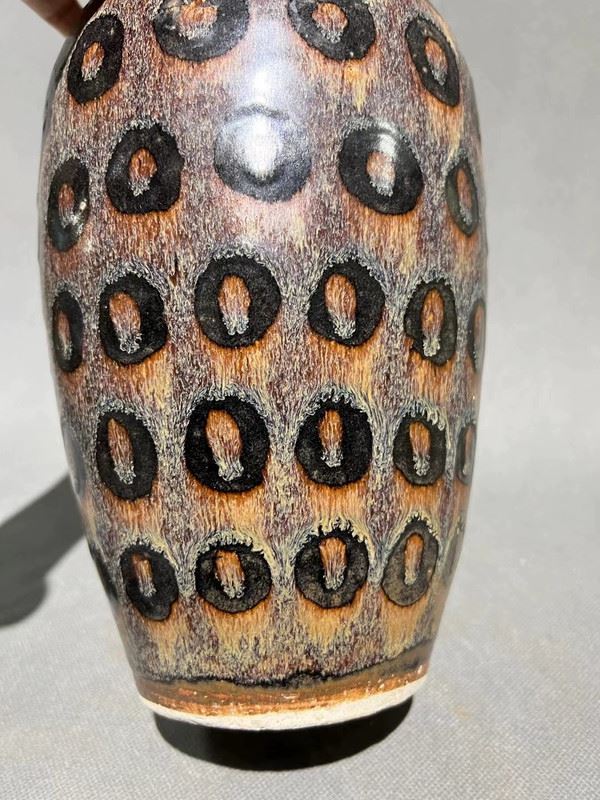 This ceramic vase features a striking polka dot pattern, with black circles painted over a dark base glaze. The design creates a unique visual impact, blending traditional craftsmanship with modern aesthetics. It is both functional and artistic, making it an ideal decor piece for any space.
