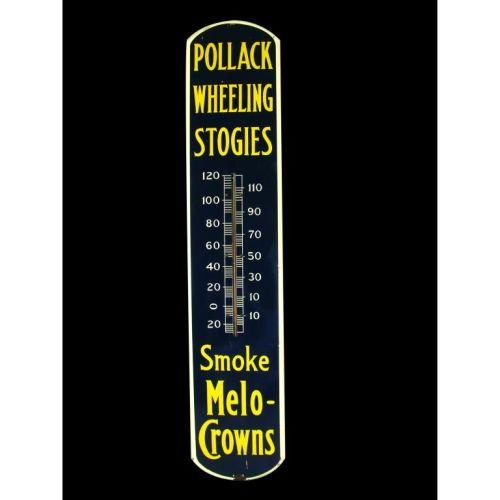 Pollack Wheeling Stogies Tin thermometer. Minor scratches at the bottom, otherwise excellent condition. 8 x 28 1/2 inches