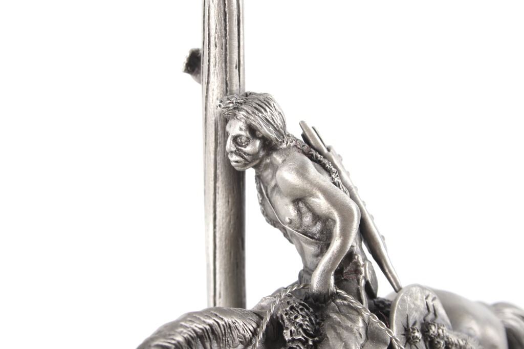 Featured in this lot is a fine pewter sculpture for Chilmark Fine Pewter by Western and Wildlife artist, Don Pollard, titled "Singing Wires". The coming of the white man meant more than just an infusion of strange people, but the intrusion of unknown structures on the Native American’s unblemished lands. This piece features a Native American warrior listening to the hum of the telegraph lines, puzzled at the meaning of these 'singing wires'. This limited edition, remarkable piece shows stunning detail and is on a solid wood base. It is in excellent condition; there are no defects noted. It measures 8.5" H x 6.25" diameter.
