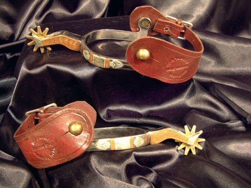 Pollard Lady Legs Spurs, double mount silver and copper overlay, Ft.Worth, TX. Leathers by Mel Parker Amherst, NB. Good condition.