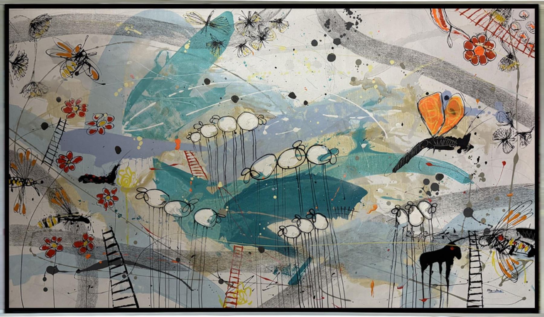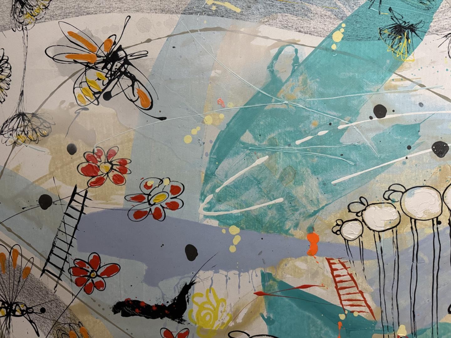 This dazzling original acrylic on canvas, hand-signed by the artist, represents a remarkable fusion of creativity and craftsmanship this artwork comes frame and ready to hang. Art size 70x40" framed size 72x42"