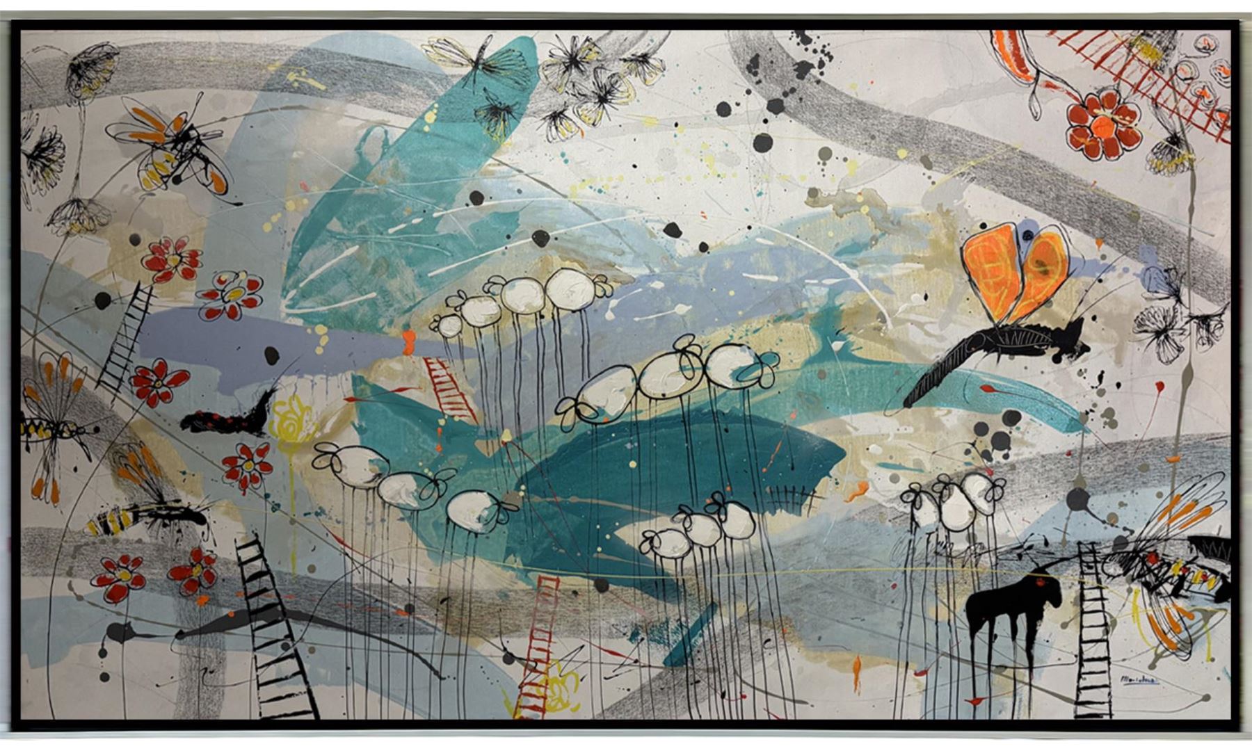 This dazzling original acrylic on canvas, hand-signed by the artist, represents a remarkable fusion of creativity and craftsmanship this artwork comes frame and ready to hang. Art size 70x40" framed size 72x42"