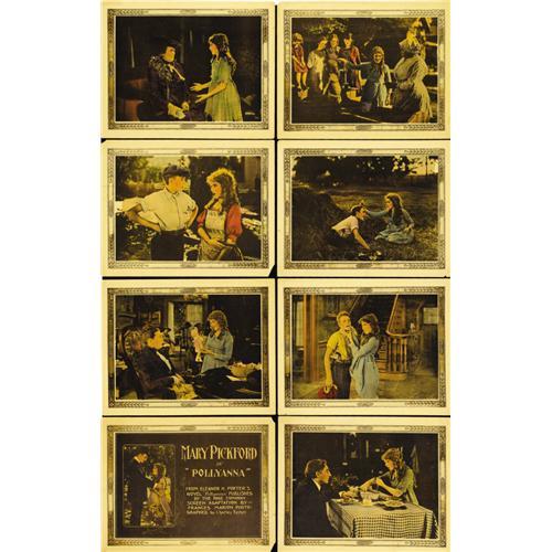 <B>Pollyanna (United Artists, 1920).</B></I> Lobby Card Set of 8 (11" X 14"). Based on the best selling Eleanor Porters novel, Mary Pickford stars as the title character. Made at the time of her greatest stardom, Pickford plays the optimistic child in this silent classic. This hand-tinted lobby card set has some slight edge wear and corner chips off of the title and another card. There are minor creases and bumps. One card has some significant scuffing. This is a very rare set. Fine. <BR><BR><b>Shipping:</b> Small Flat (<a target="_blank" href="http://www.heritageauctions.com/common/shipping.php">view shipping information</a>)