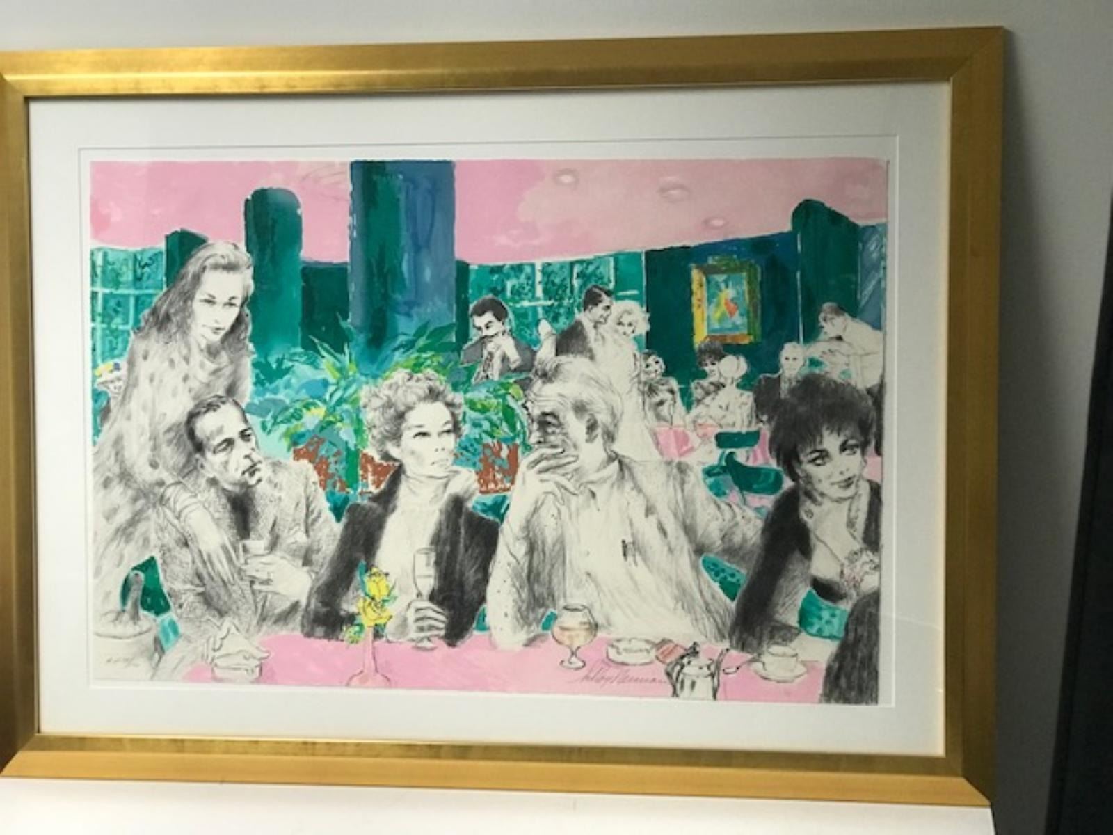 "Polo Lounge" by LeRoy Neiman Set - Limited edition serigraph #1 of 250 = 2 Matching pieces 48" x 35" each. "Polo Lounge" by LeRoy Neiman - COA Included - This is a rare Diptych Serigraph by LeRoy Neiman titled "Polo Lounge" from his tribute to his infamous bar and social scenes across the world. ~ "I bring personal and sentimental baggage to this work," Neiman explained. "As a guest, I have felt at home in the bungalows of The Beverly Hills Hotel for many years. As a stargazer, I have always enjoyed the unique showcase that is the Polo Lounge. Stars here have left a special imprint on my memory, so there was something magical for me in creating this sampling of Hollywood's elite." And what a sampling it is! LeRoy Neiman has drawn together a remarkable group of personalities who have dominated the Hollywood scene from both in front and behind the cameras. Near Marilyn Monroe and Clark Gable sits a sly W.C. Fields, and, yes, he is holding his menu upside down. Famed gossip columnist Hedda Hopper is perched within earshot of Bogie and Bacall, who seem to be keeping an eye on Katherine Hepburn and John Huston. Elizabeth Taylor, regal and bejeweled, enjoys a quiet cup of coffee. Frank and Barbara Sinatra are making their entrance, perhaps to join Frank's fellow "Rat Pack" buddies Dean Martin and Sammy Davis, Jr., who have already arrived. Star-makers Darryl F. Zanuck and Howard Hughes are here, as are Johnny Carson and Joan Collins from the world of television. Film greats Gary Cooper, Bette Davis, Errol Flynn, Marlene Dietrich and Greta Garbo all help lend a magical air to this glittering assemblage. It is no wonder that LeRoy Neiman feels such a special warmth toward this magnificent work.