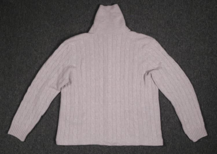 This is a Polo Mens Cashmere Cardigan Sweater with Button Up front. It is in Like New condition, worn only once or twice. The color is a natural oatmeal tone, and the pattern is cable-knit with wide flat collar. The size is Extra Extra Large. This is a classic and comfortable sweater that is sure to become your favorite.