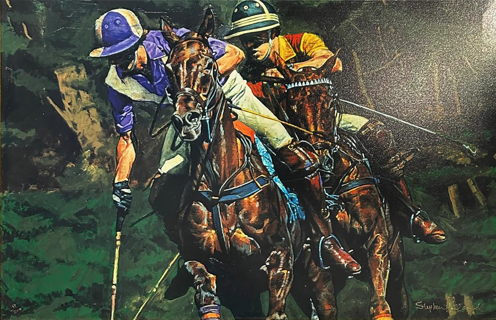"Polo Players" signed by 4 players (Lucas L, Pablo Spinacci, G. Colerain & unk.)Giclee by Stephen Holland 27.25" x 42" AP1 stretched canvas, COA