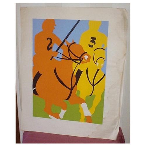 This large serigraph is titled "The Rich are Different." It is signed by Spou, and numbered 28/35.<p>Unframed, the measurements are: 30 1/2 tall, by 25 1/2 wide.<p>In very good condition, has water mark on the white boarder on the right hand side angled to the bottom.<p>The colors are vibrant. Rider numbered "2" and polo pony (with white leg wraps) is in orange. Rider numbered "3" and polo pony is in yellow. Blue sky and green grass background. Numbers, boots, bridles and polo stick are in black. No shade variation or details in figures, only white nostrel on horses. This picture is unique, as your imagination must provide the looks on the players faces and the fireiness in the ponies.<p>This is a wonderful picture for any horse lover or polo enthusiast.