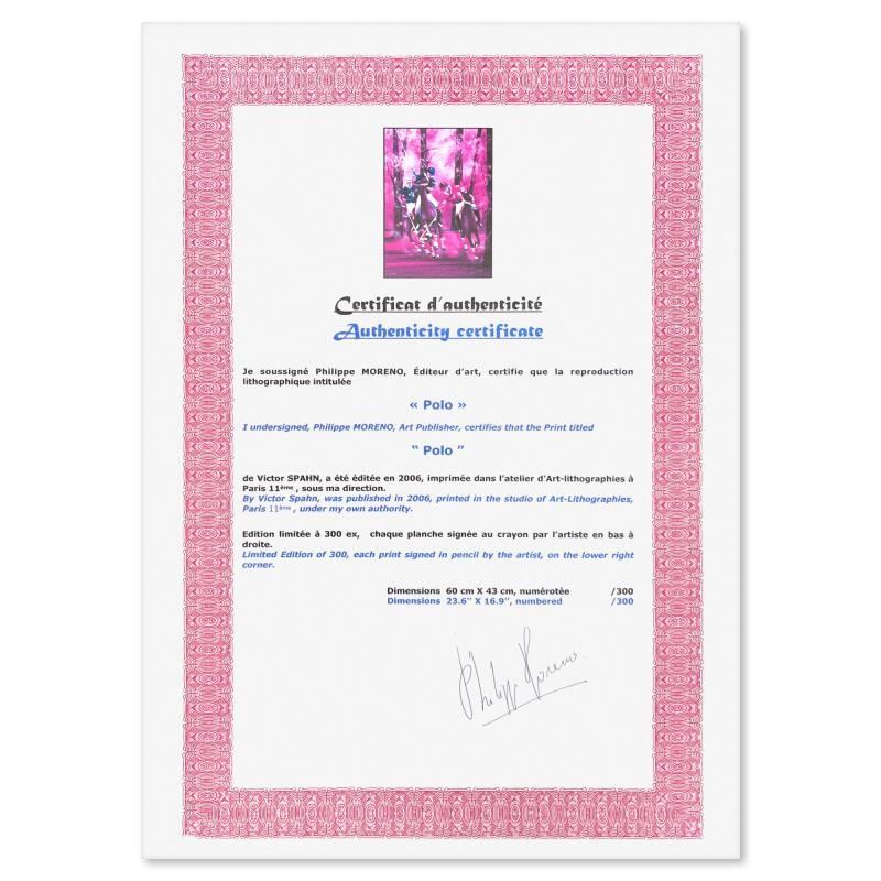 "Polo" is a limited edition lithograph on paper by Victor Spahn. Printed at Art-Lithographies workshop in Paris, the piece is hand signed by the artist and comes with a certificate of authenticity. Measures approximately 23.5" x 17" (image).
