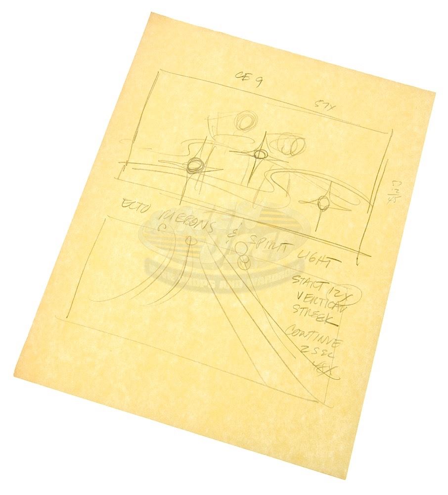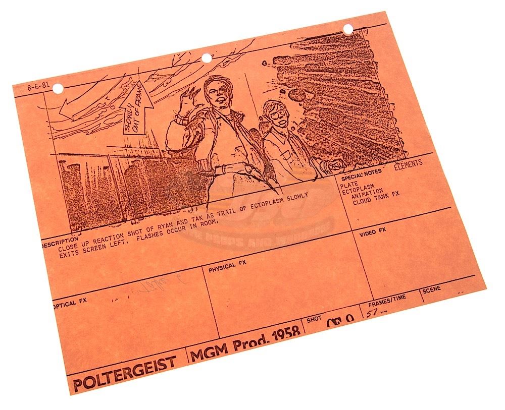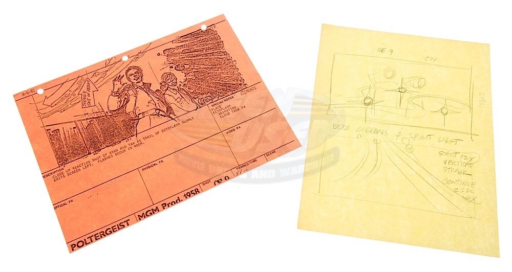 (MGM, 1982) This lot consists of a production storyboard copy and original hand drawn storyboard. The production used copy is dated 8/6/81 that details the movement of the Ectoplasm. The sheet of paper features two rough hand drawn storyboards also detailing the Ectoplasm and light movements. Both pages measure 8.5" x 11".