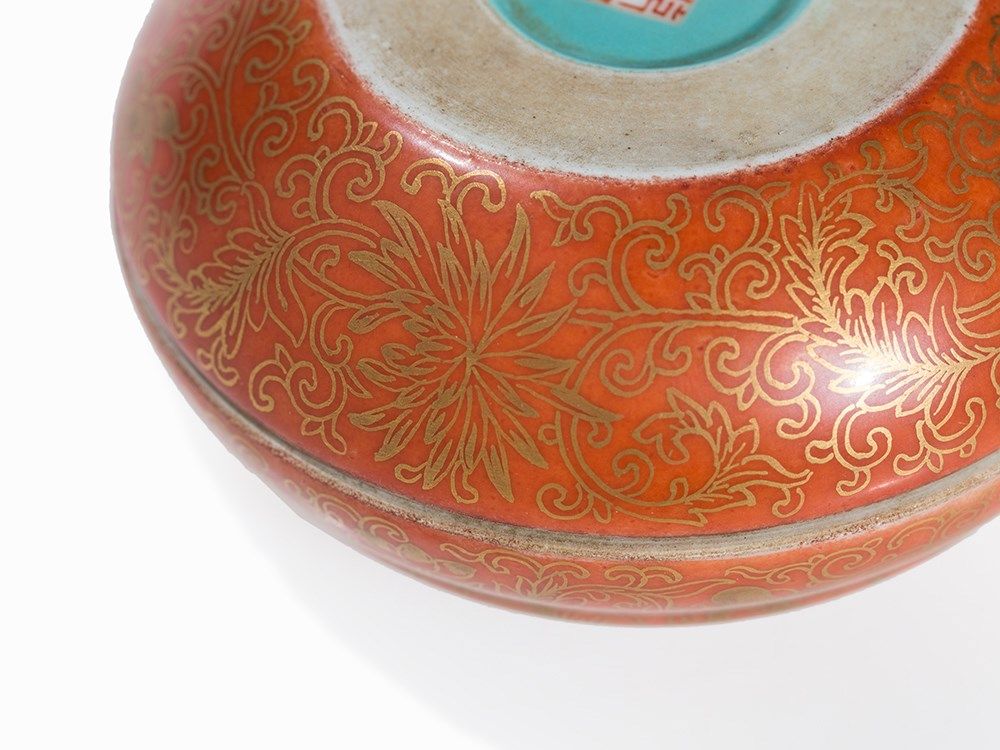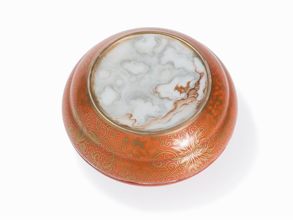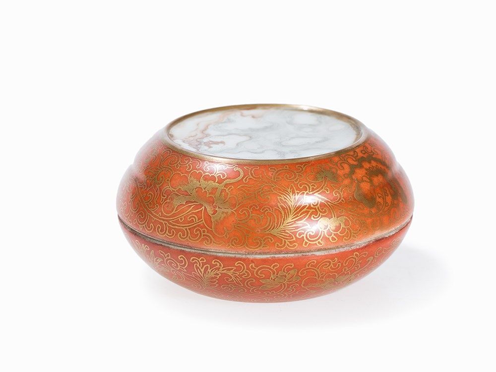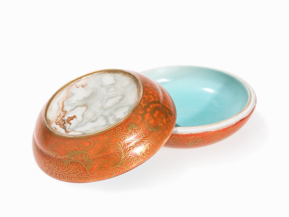 Condition: The porcelain box is in good condition with only slight gold wear along the rims. The diameter is 9 cm.