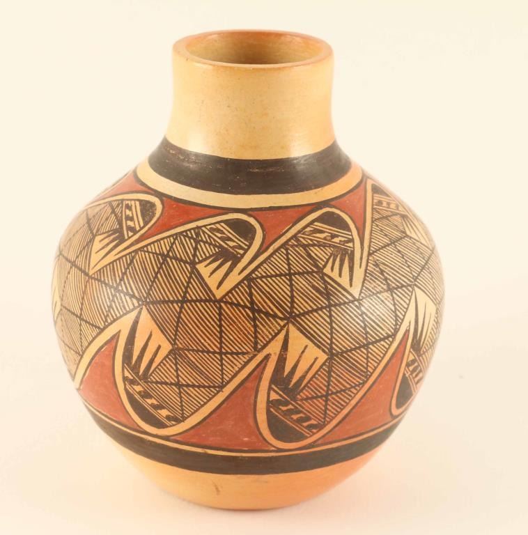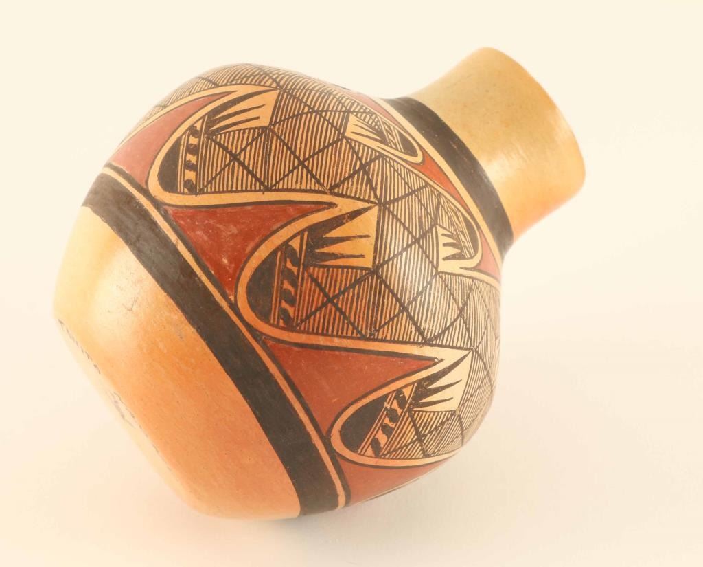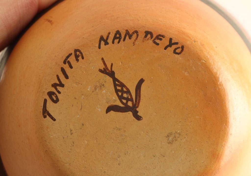 Signed on base'Tonita Nampeyo, geometric design, measures 4"h x 3 1/4"dia. Good condition.