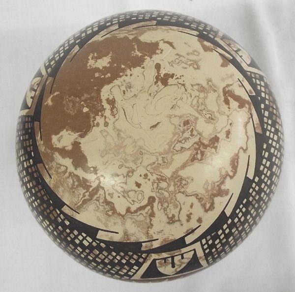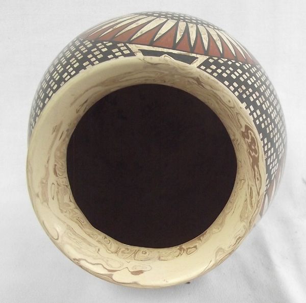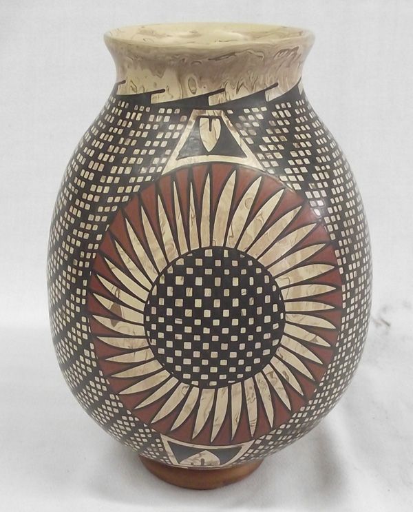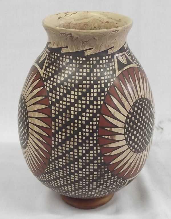 Polychrome Mata Ortiz Sunflower Jar - Luis Ortiz, this beauty features marbleized clay, sunflower design with stylized feather design petals, eye dazzling checkerboard designed background, pulled spout, geometric line designs around back and rim, cream-black-rust-light brown in color, measures 8''H x 6.25''W