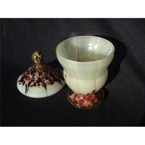 Exquisite European polychrome art glass container with lid, hand-blown. Height: 7.5" (19 cm.). Diameter at top: 5" (12.5 cm.). Estimated value: $900.