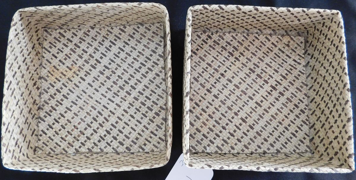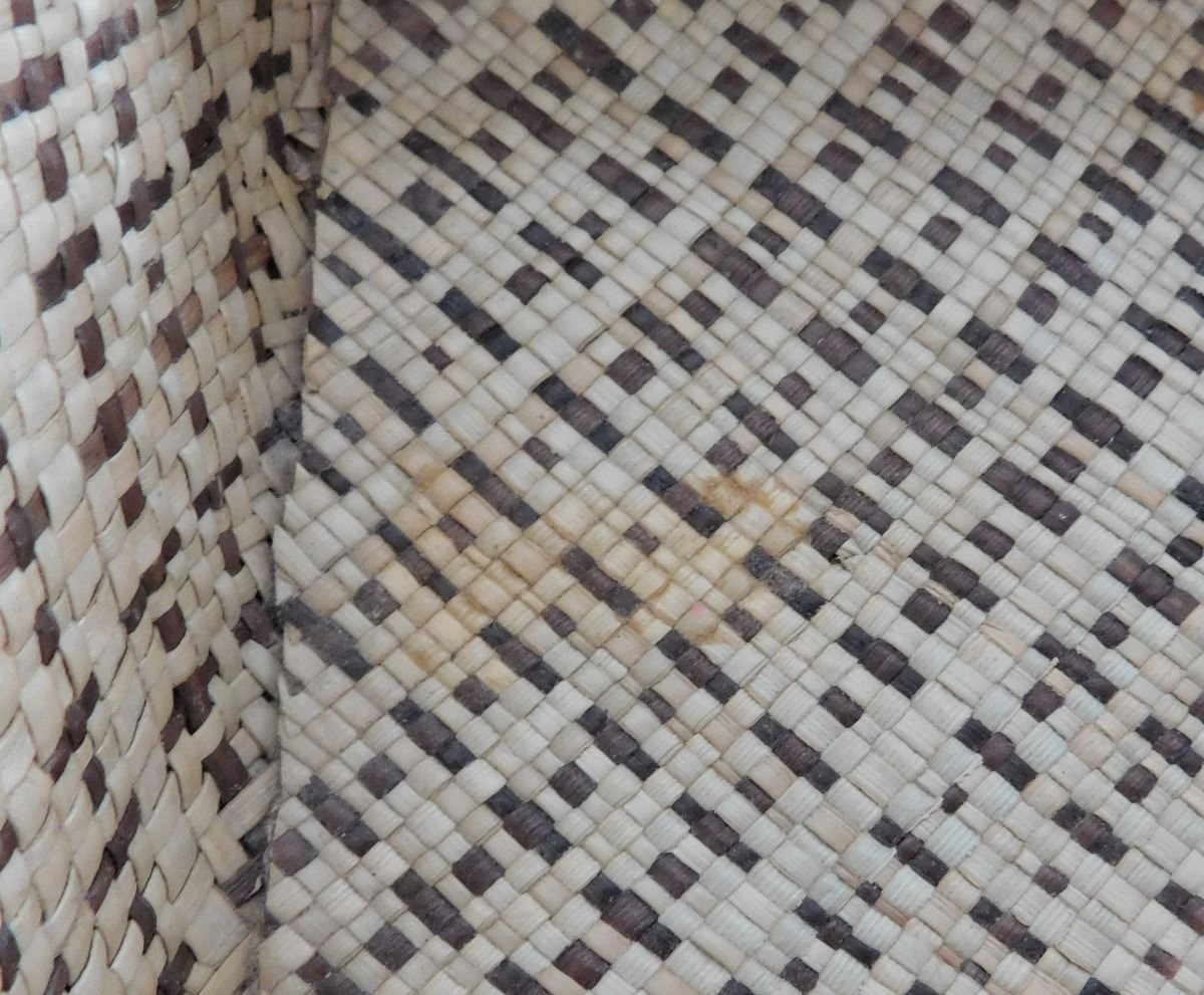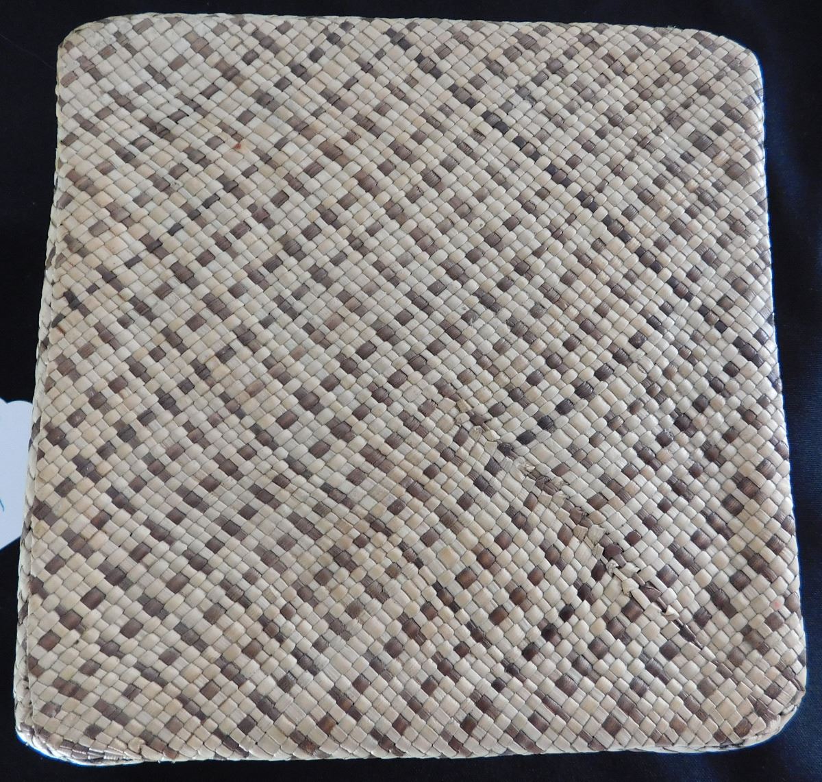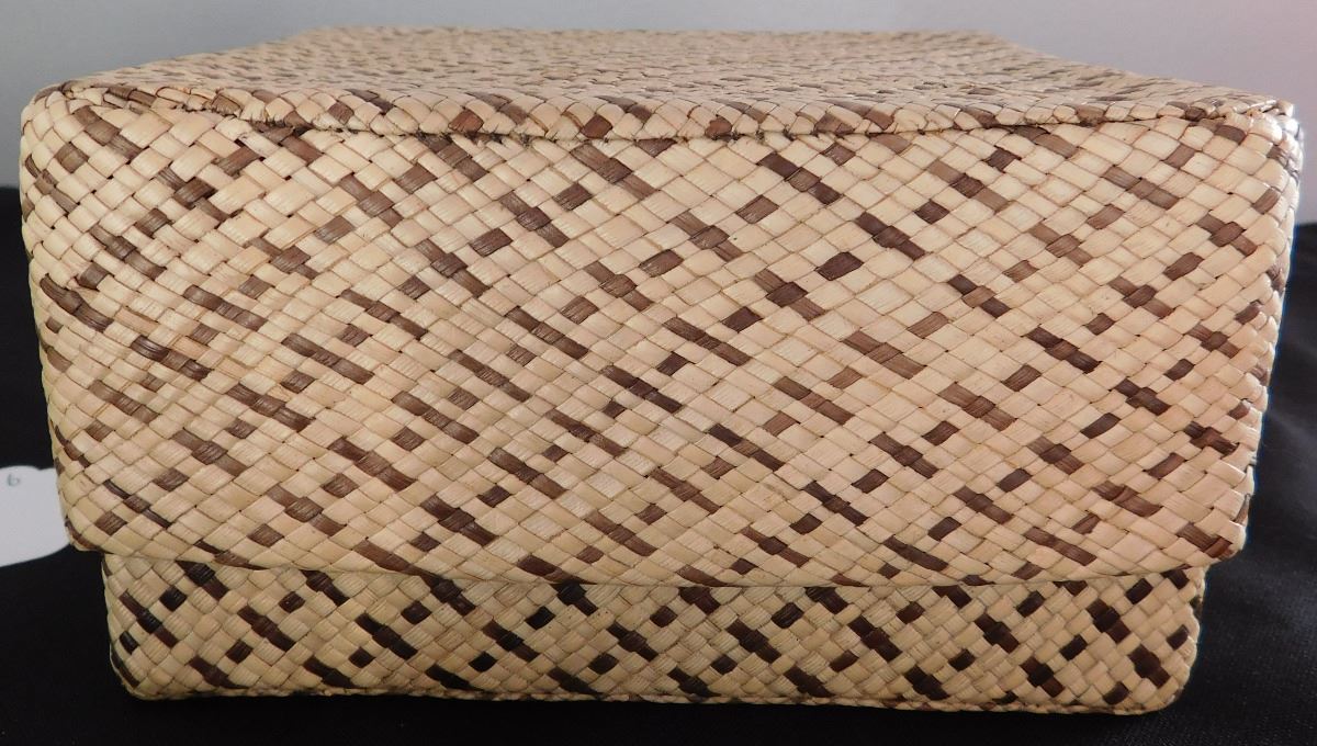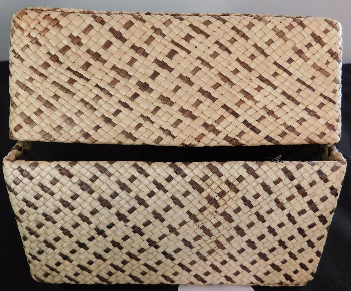 Polynesian Basketry Box, made circa 1950s of reed fiber, item measures 6" x 6" x 3". Possibly from Hawaii, USA. Fancy design on basketry. Condition: Fine, see images. Shipping: $14.50.