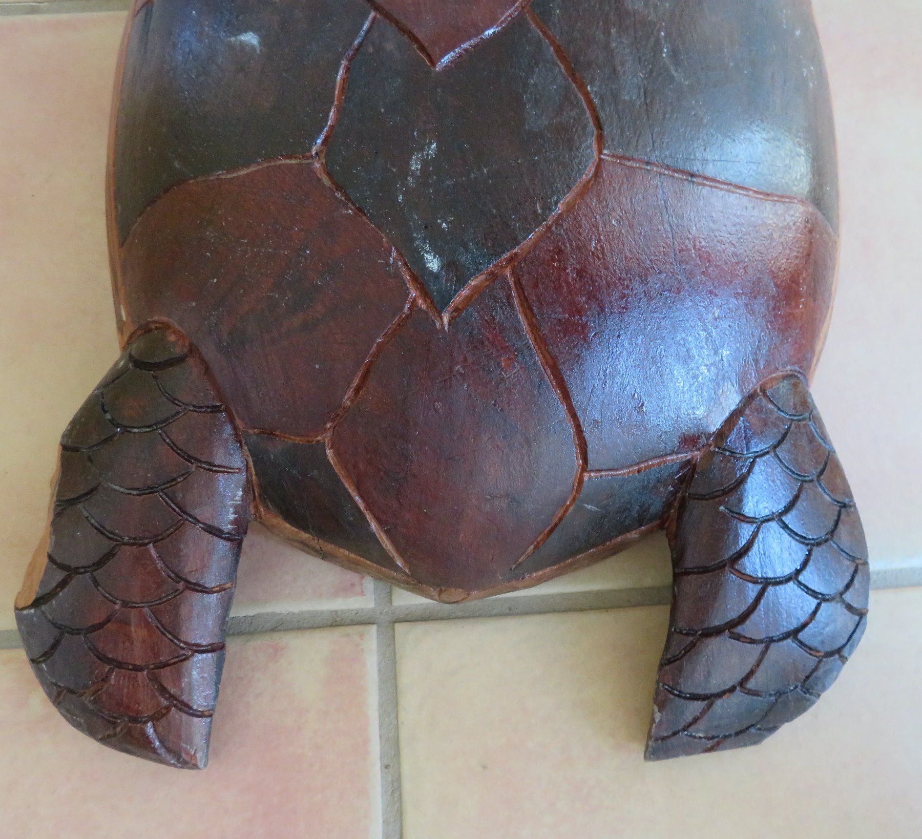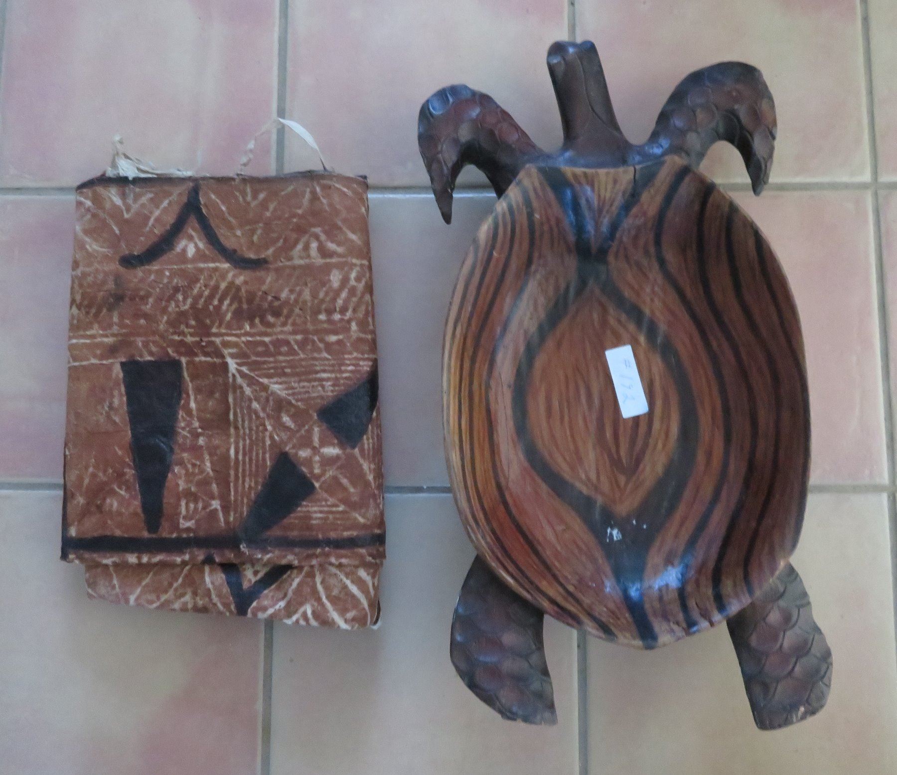 Polynesian Collection, c. 1940s. Made of wood and tapa cloth, the turtle measures 25" x 13", tapa cloth is 5' x 5'. Condition: Tapa has large tear, see images. Shipping: $40.00 w/insurance and signature, due to size and weight.