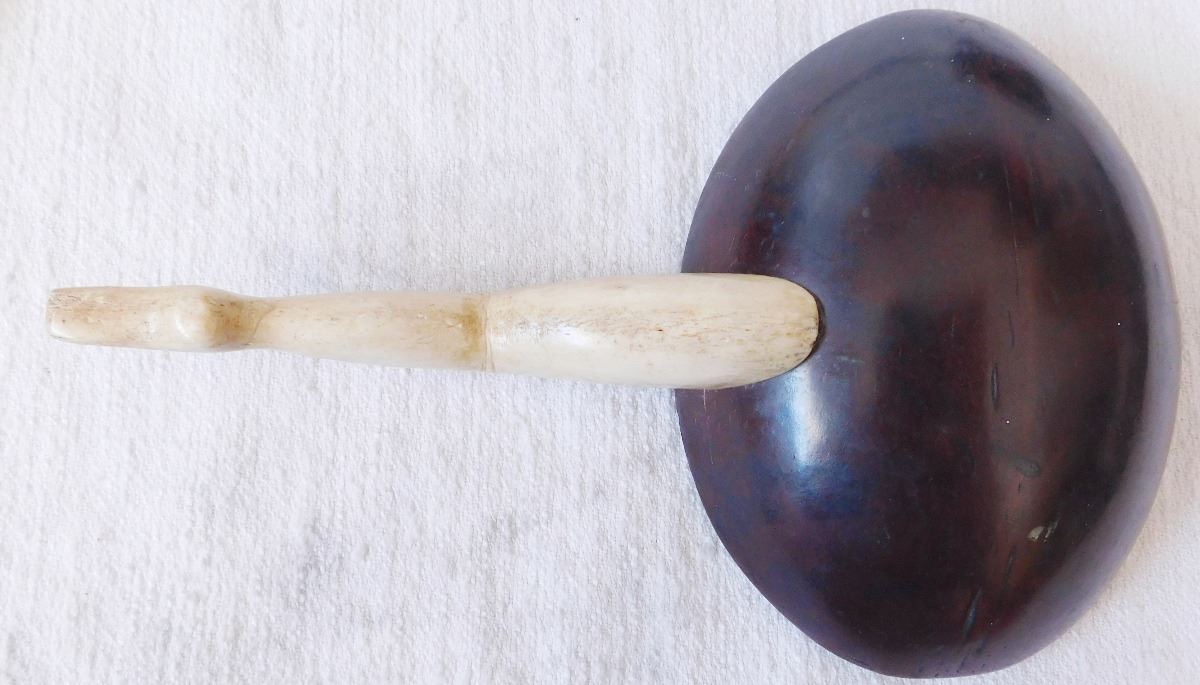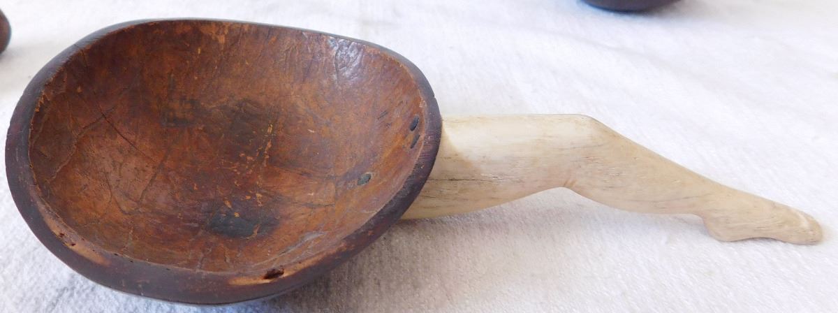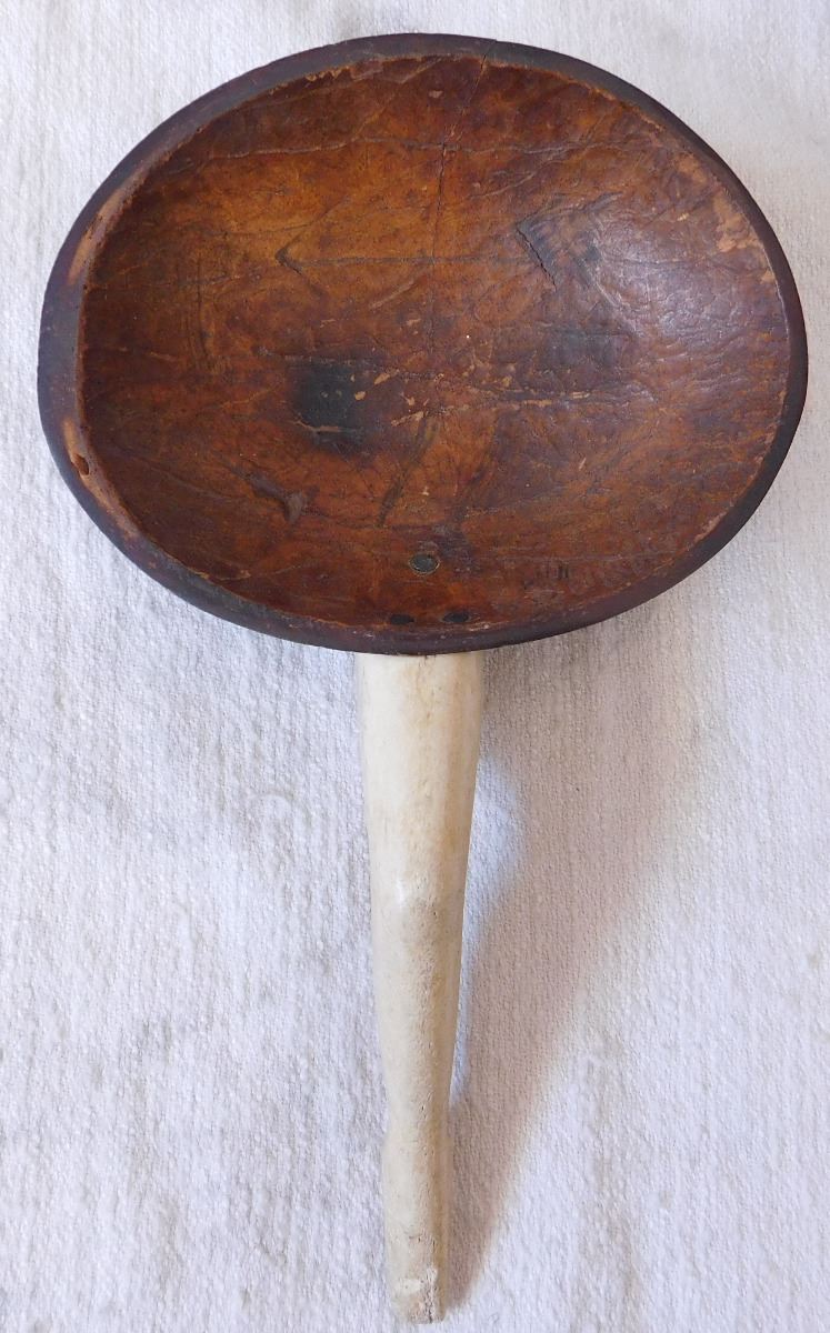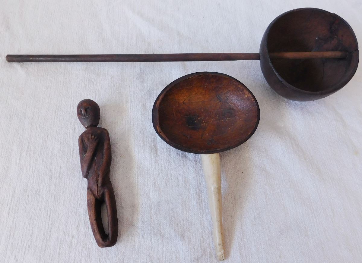 Polynesian & Eskimo Carvings, circa 1900. Made of wood, coconut shell and bone, the longest is 16". From Hawaii and Alaska. A knowledgeable collector has contacted us regarding the Human figure, believing it be old Eskimo, gal leg dipper, ladle. Condition: Good, see images. Shipping: $30.00 due to length.