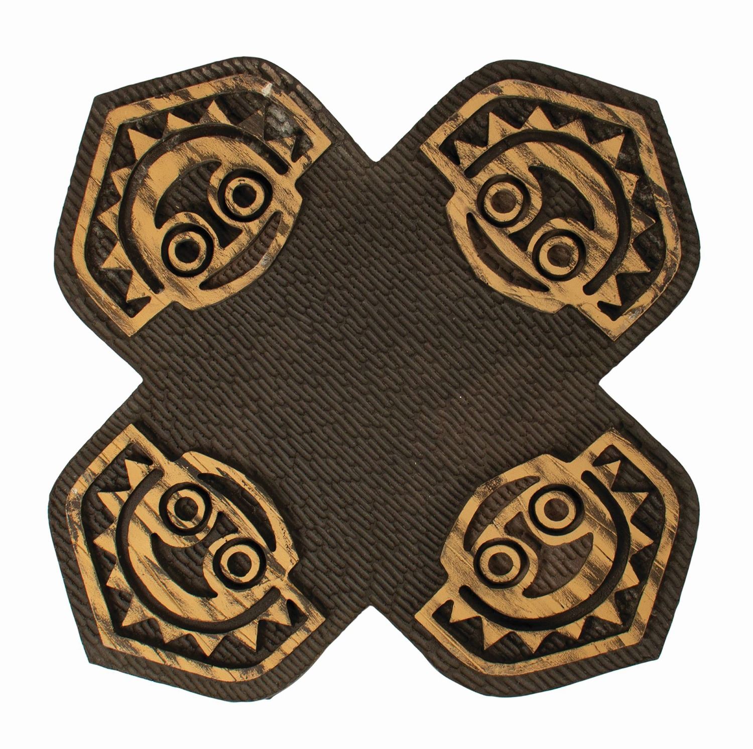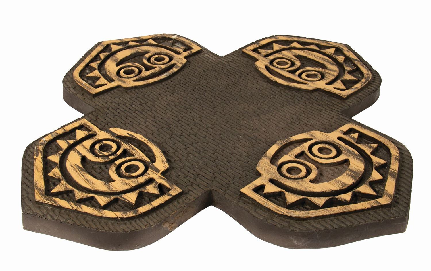 (Polynesian Resort, c.2000s) A tiki-style parking lot sign constructed of high-density urethane designed to look like hand carved wood. The sign features the resort's smiling tiki god mascot at each point of the cross. The middle of the sign is blank where a letter would have been added to denote a specific area of the parking lot. Measuring 22.5"x22.5" and 1" deep, the piece is in fine condition with only minor wear.