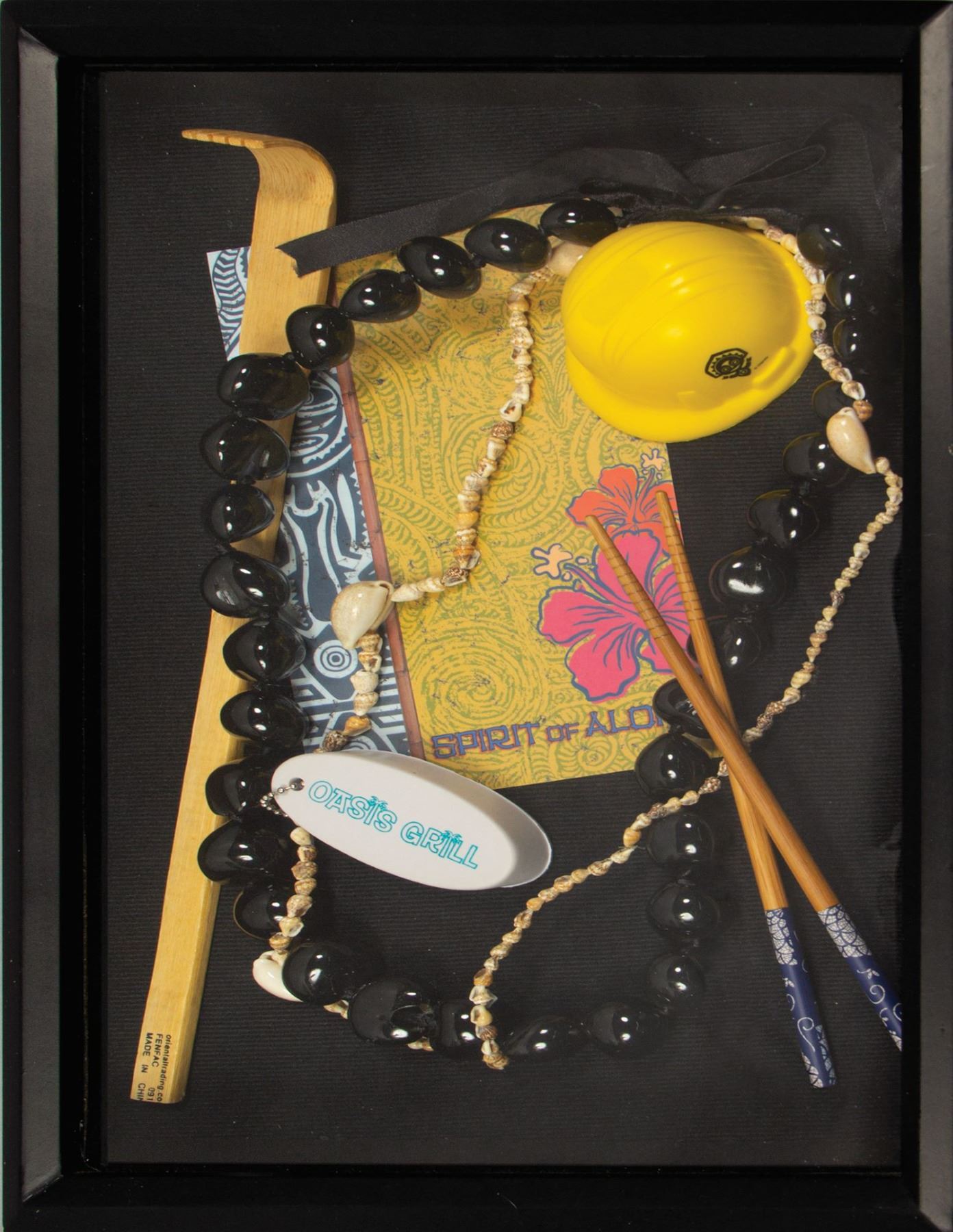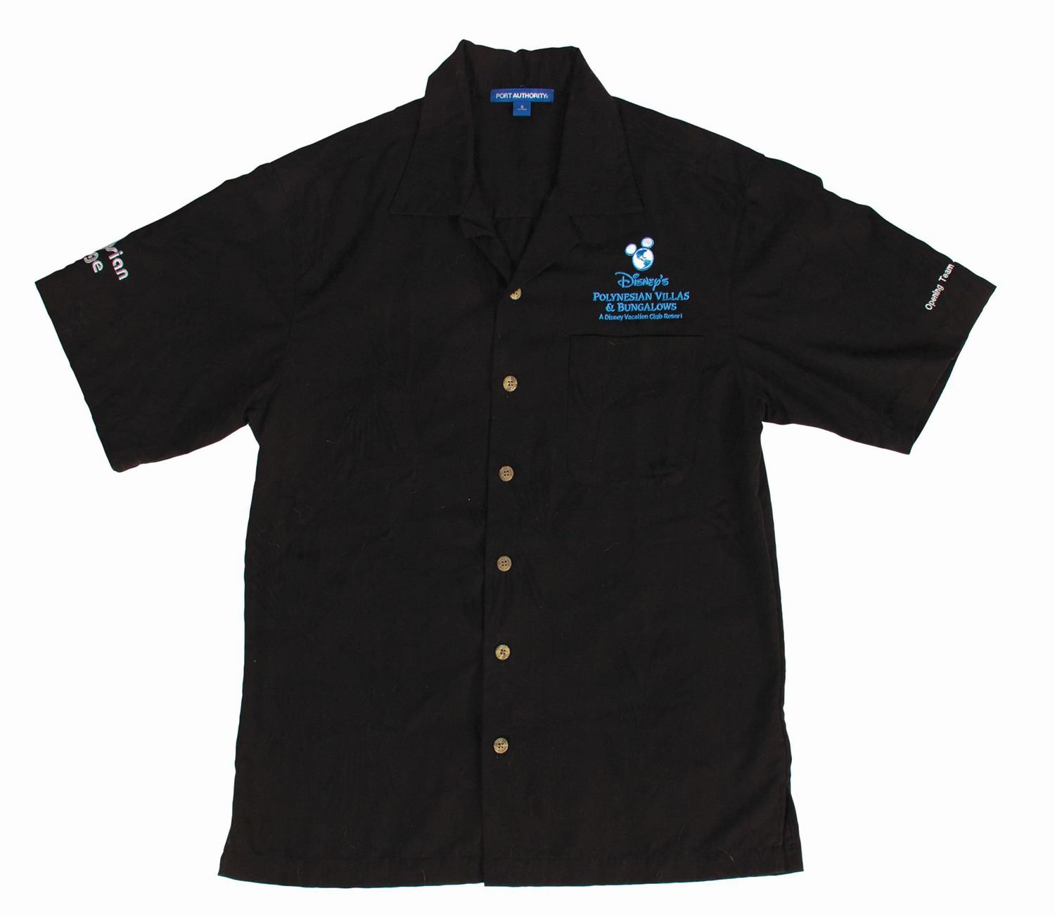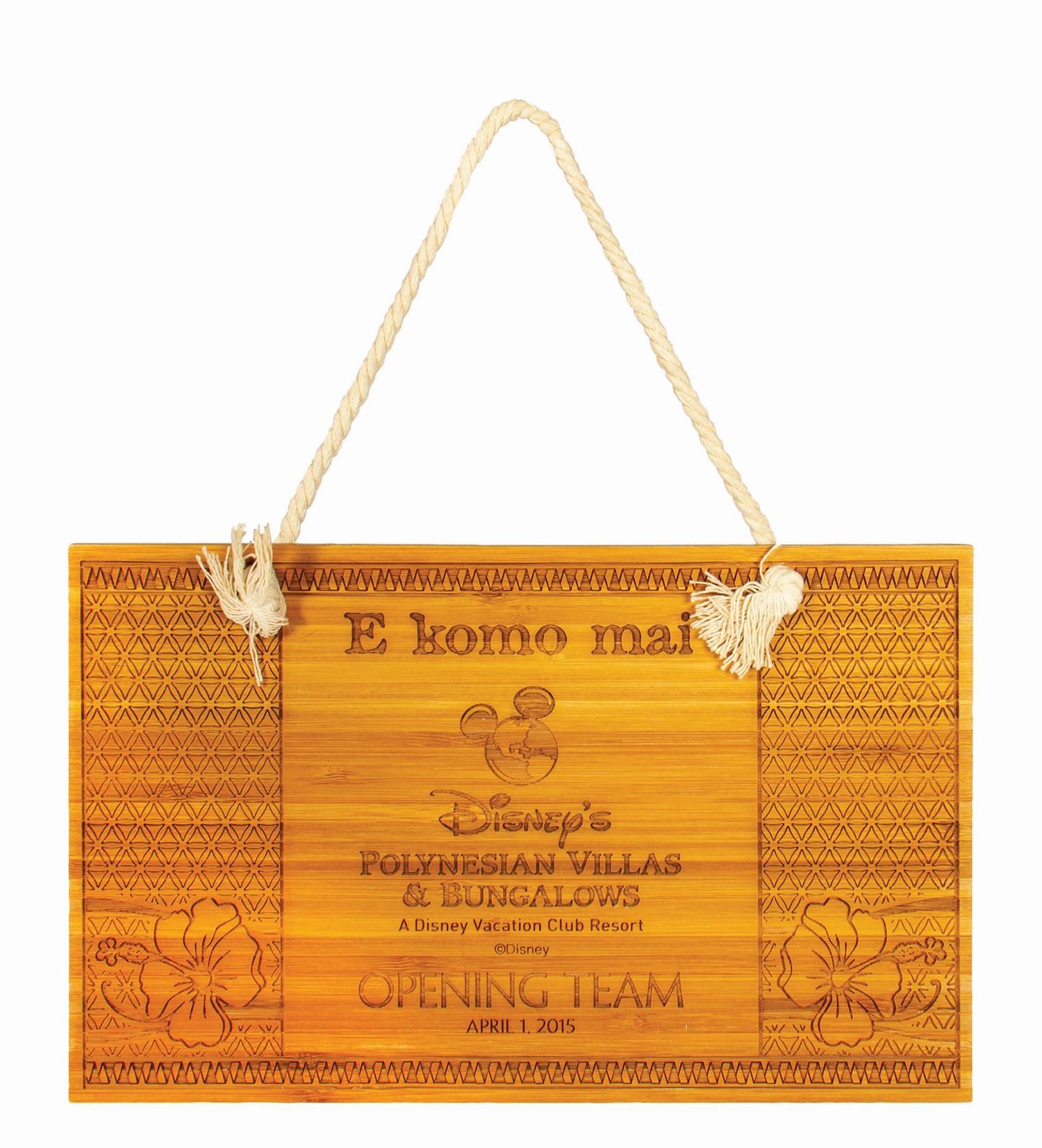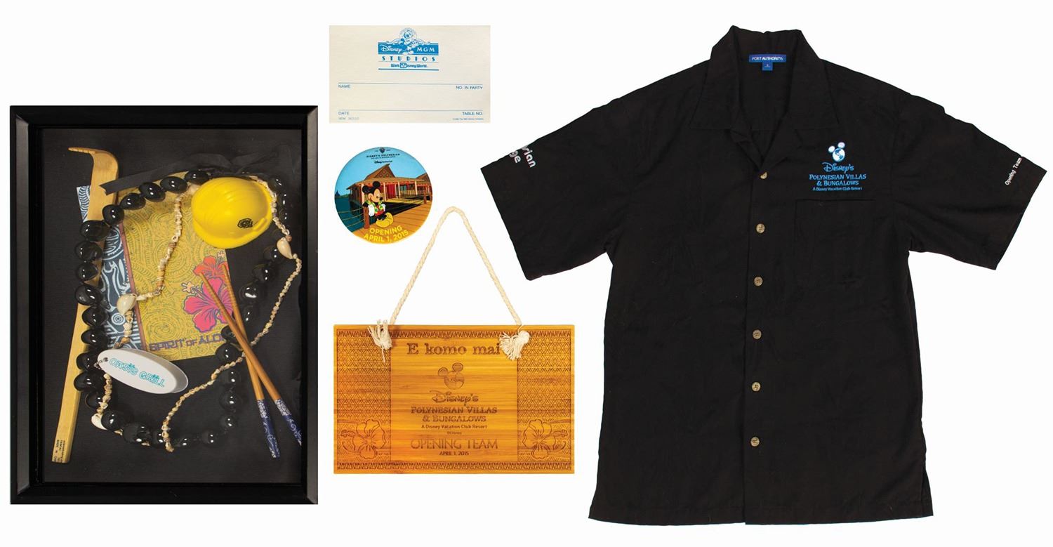 (Polynesian Resort, 2015) A collection of (4) items given to the grand opening team for the Polynesian Villas & Bungalows. The villas were added to the Polynesian Resort as part of the Disney Vacation Club and opened on April 1, 2015. The collection includes a button, wall plaque, button-down shirt, and shadow box collection of Polynesian-themed items which includes a miniature hard hat. The shirt is a size S, and the other items range from the 3" diameter button to the 17"x13" and 2.75" deep shadow box. The condition overall is very good, with a few small spots of surface wear to both the button and shadow box.