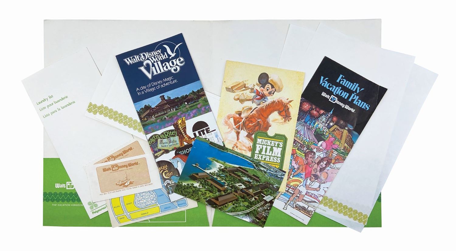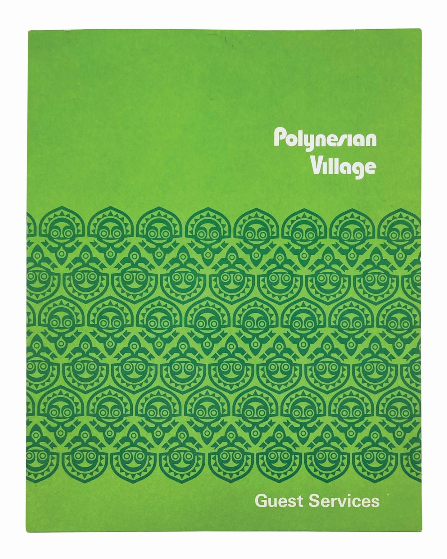 (Polynesian Resort, 1980) A vintage Guest Services packet from the Polynesian Village Resort at Walt Disney World. Housed in a folder with a Polynesian Village logo and tribal design pattern, packets like these would have greeted hotel guests upon checking in to their rooms. The contents include: a parking pass, (2) guest identification tickets, (2) sheets of 10”x7.25” Polynesian Village stationery, (2) matching envelopes, a laundry list order form brochure, a Walt Disney World postcard, a film processing envelope/order form, a Walt Disney World Village at Lake Buena Vista fold-out brochure, and a Walt Disney World Family Vacation Plans brochure. The folder measures 12”x9.5” and is in fine condition, exhibiting only minor handling.