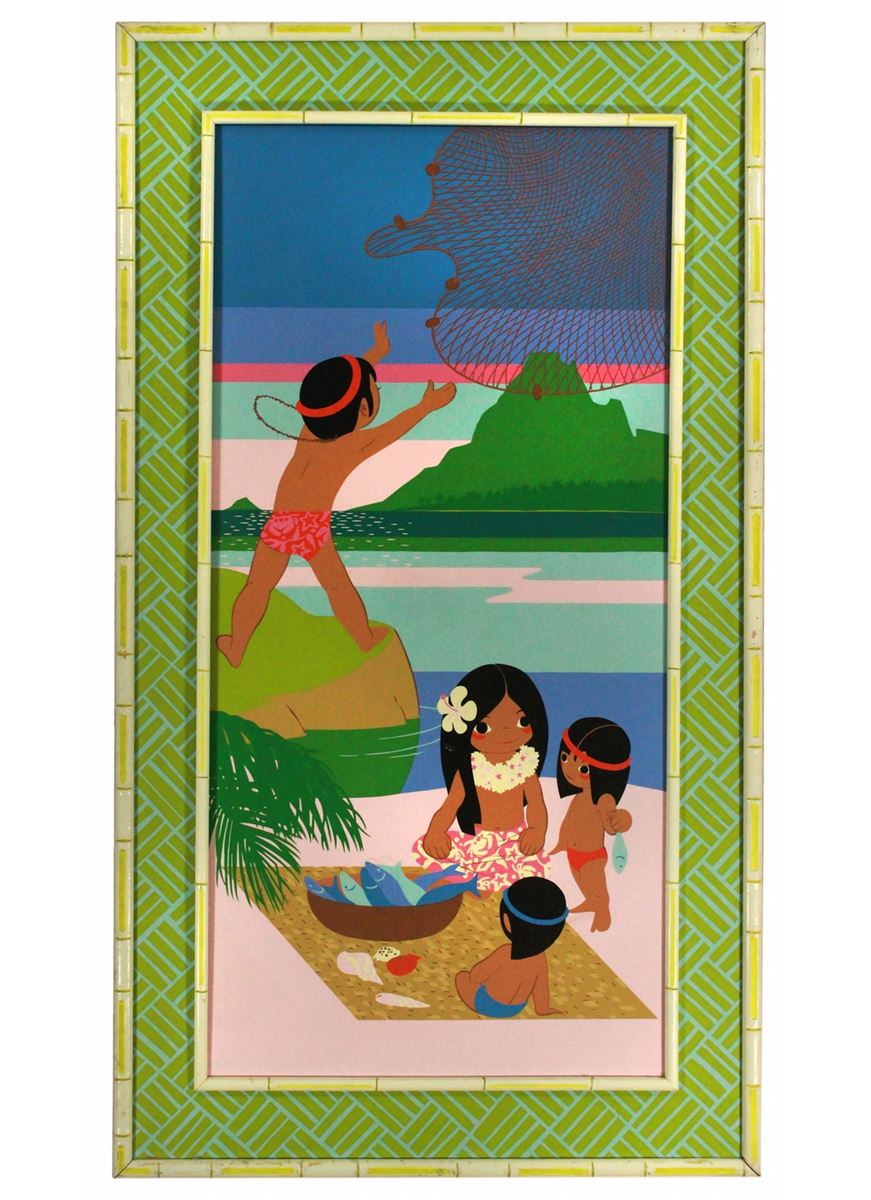 (Walt Disney World, 1970s) Beautiful silk-screened artwork that decorated the rooms at the Polynesian Village Resort. The artwork is taken from concept work by Imagineer Mary Blair. Measuring 25 x 45 in. and in good used condition with expected wear.