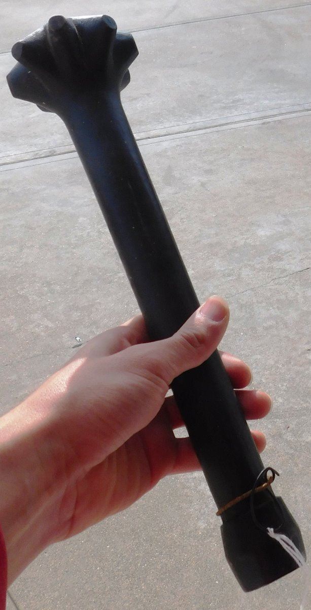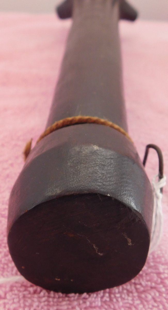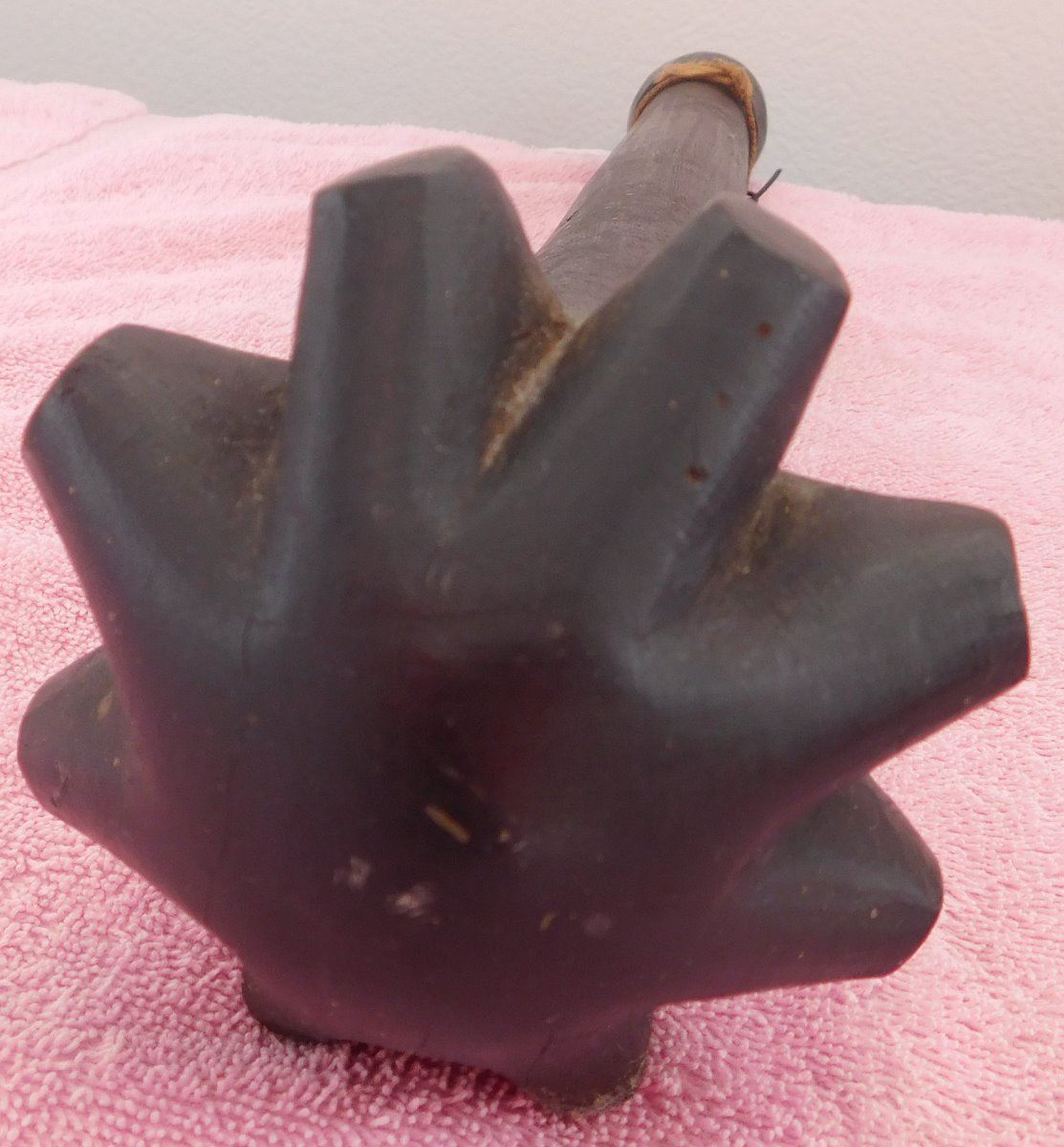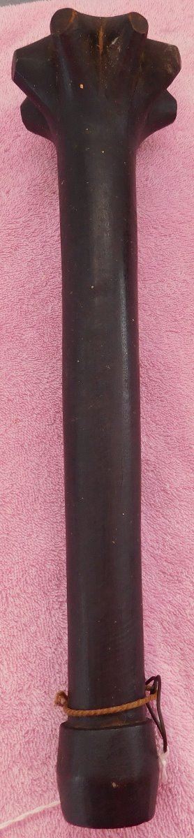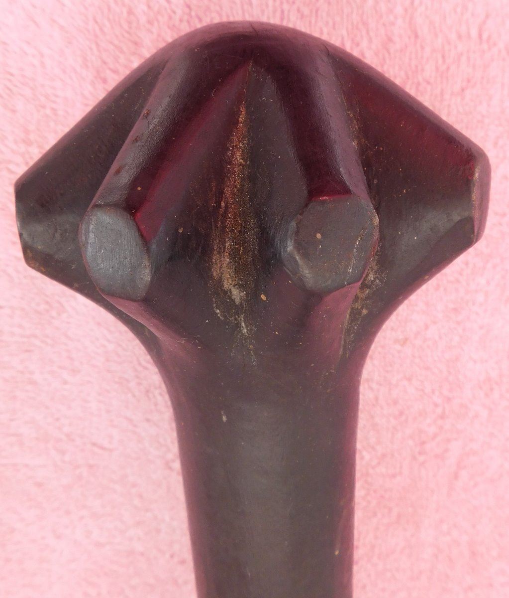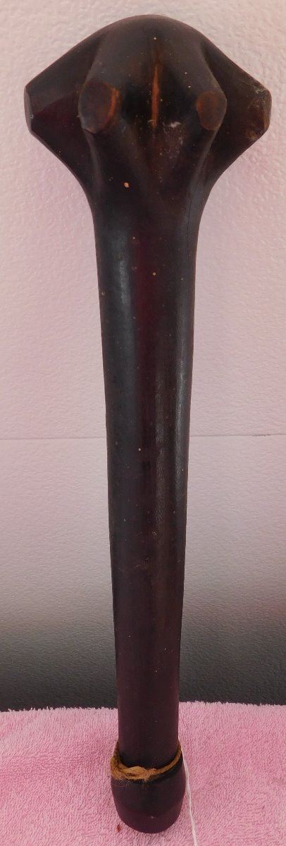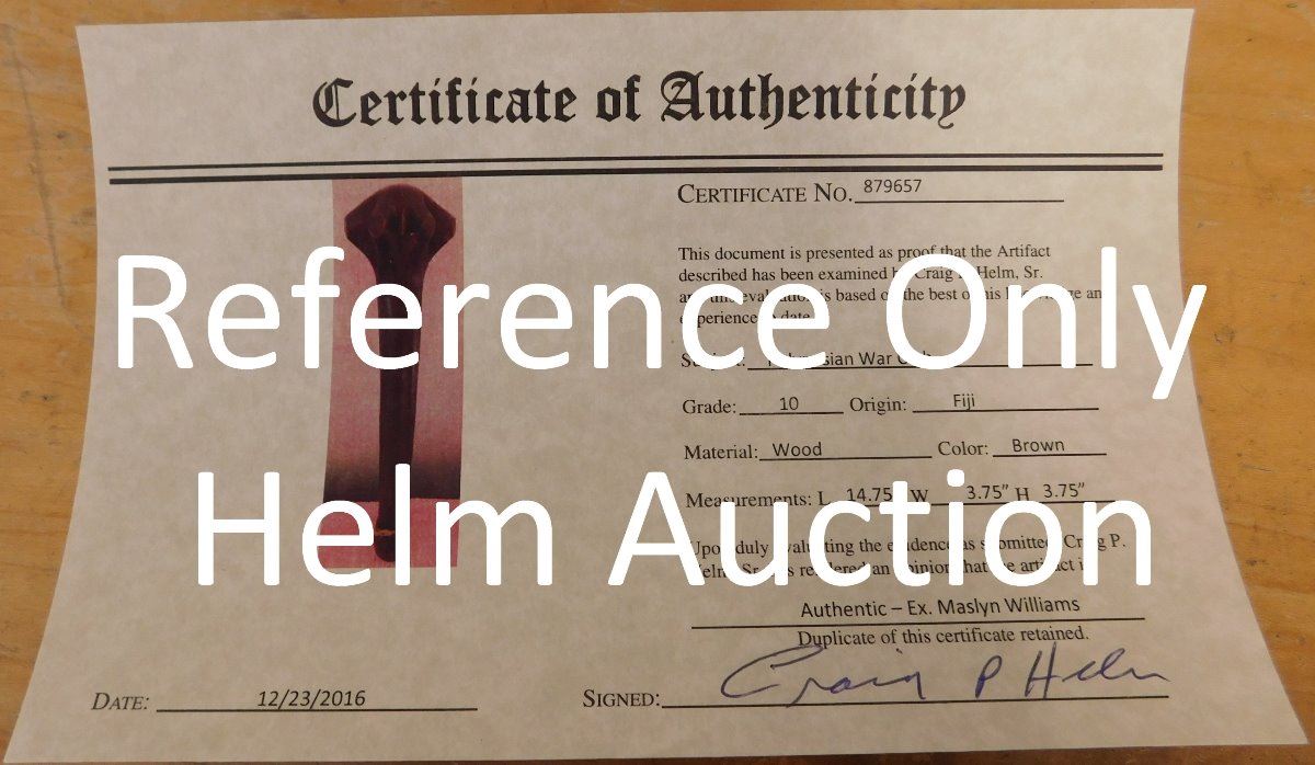 Polynesian War Club, circa WWII. Made of ebony-like wood, the item measures 14.75" x 3.75" x 3.75". Fijian. Unusual shape on club. Ex. Maslyn Williams, author of Stone Age Island. Helm Certificate of Authenticity. Condition: Very good, see images. Shipping: $25.00 w/insurance and signature, due to length.