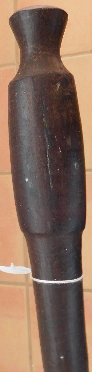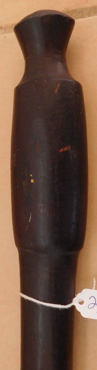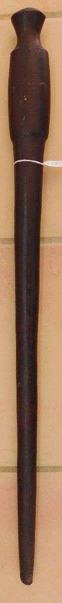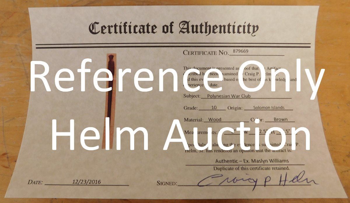 Polynesian War Club, circa WWII. Made of hardwood, the item measures 29.5" x 2.5" x 2". Solomon Islands. Lethal war club, not a toy. Ex. Maslyn Williams, author of Stone Age Island. Helm Certificate of Authenticity. Condition: Good, see images. Shipping: $30.00 w/insurance and signature, due to length.