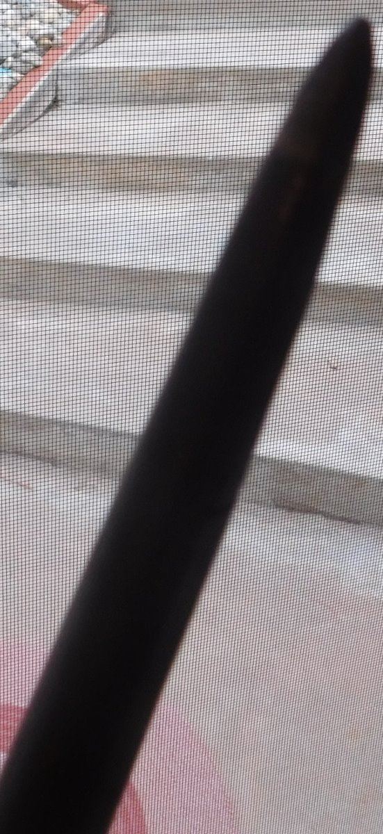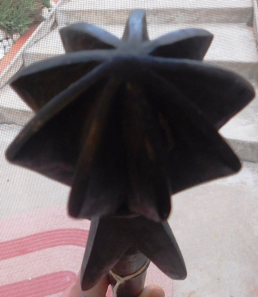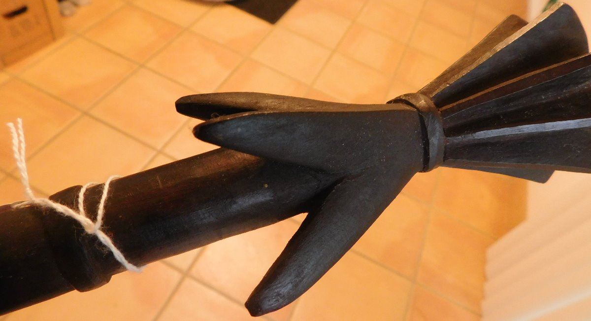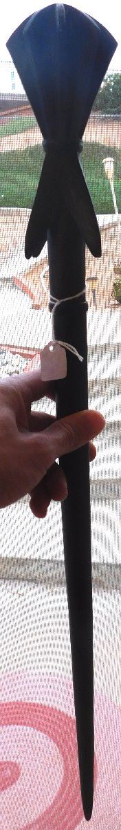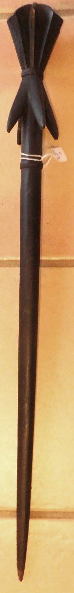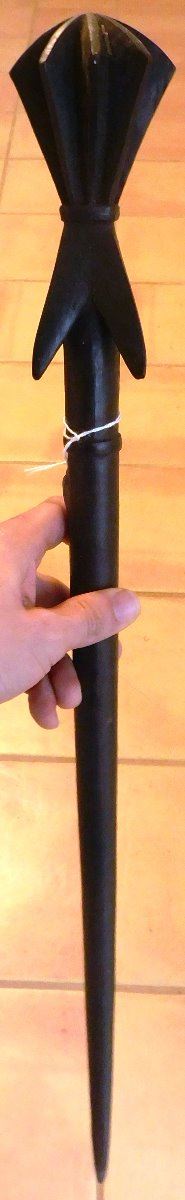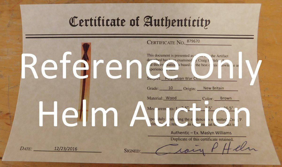 Polynesian War Club, circa WWII. Made of ebony-like hardwood, the item is 26.5" x 2.5" x 2.5". New Britain. Fancy carving with an unusual striking area. Ex. Maslyn Williams, author of Stone Age Island. Helm Certificate of Authenticity. Condition: Good, see images. Shipping: $30.00, due to length, w/insurance and signature.