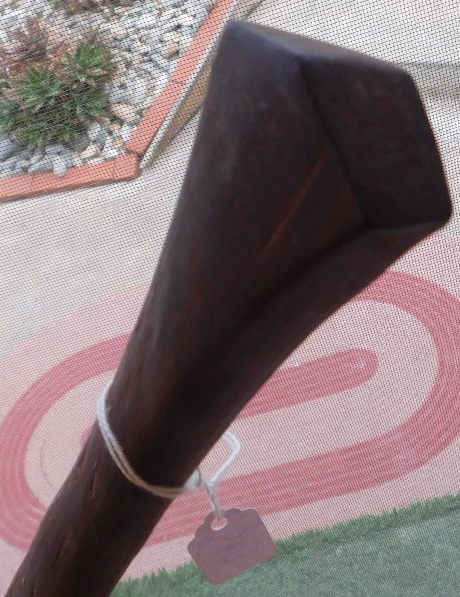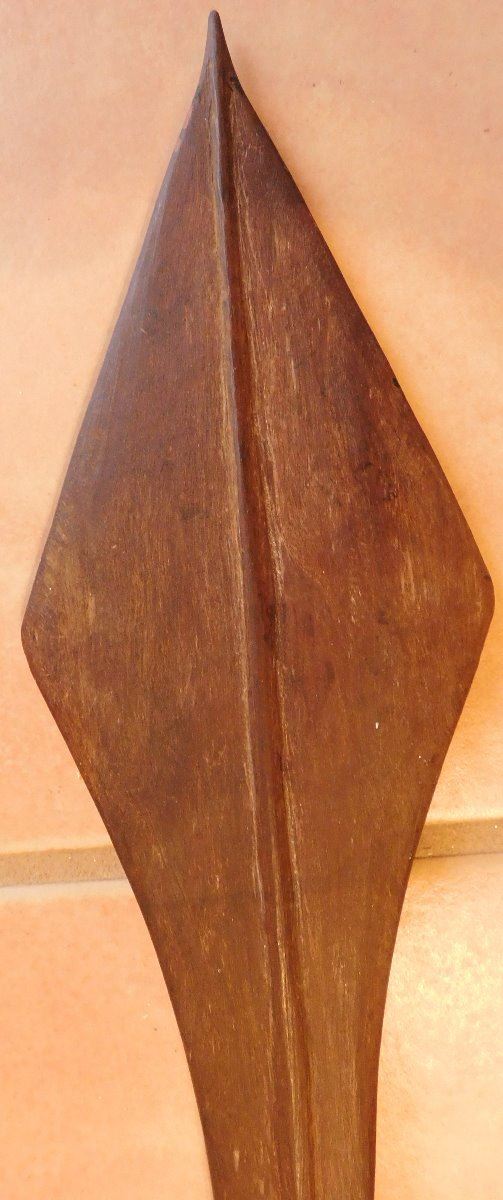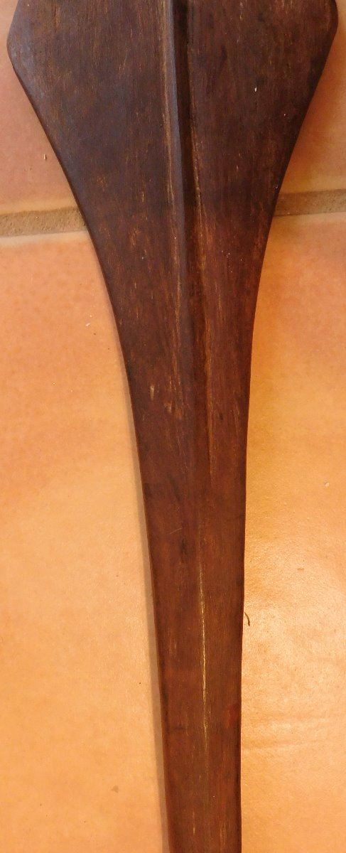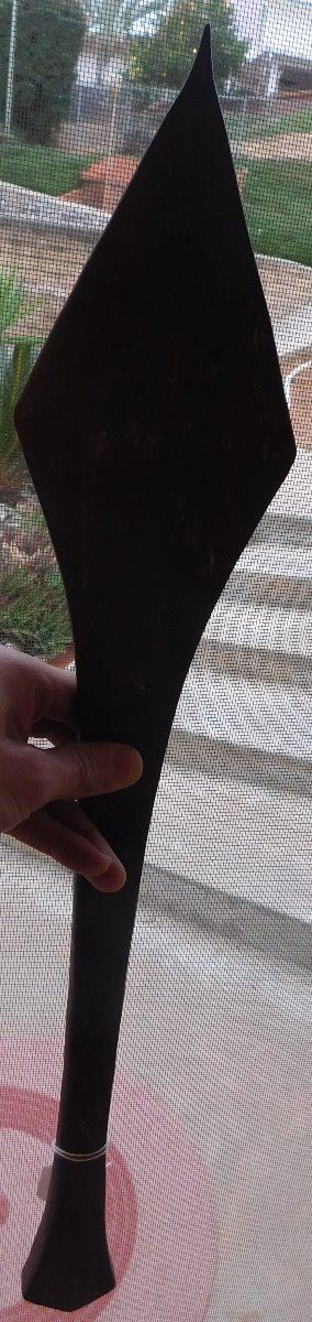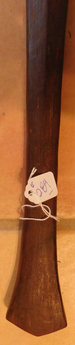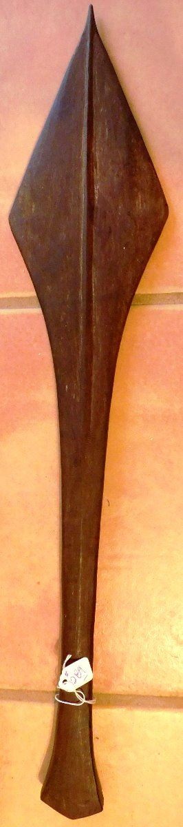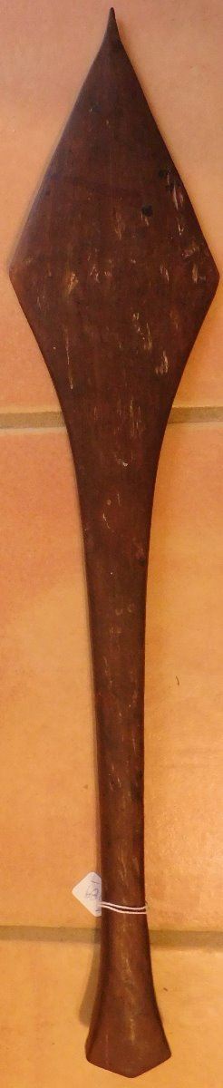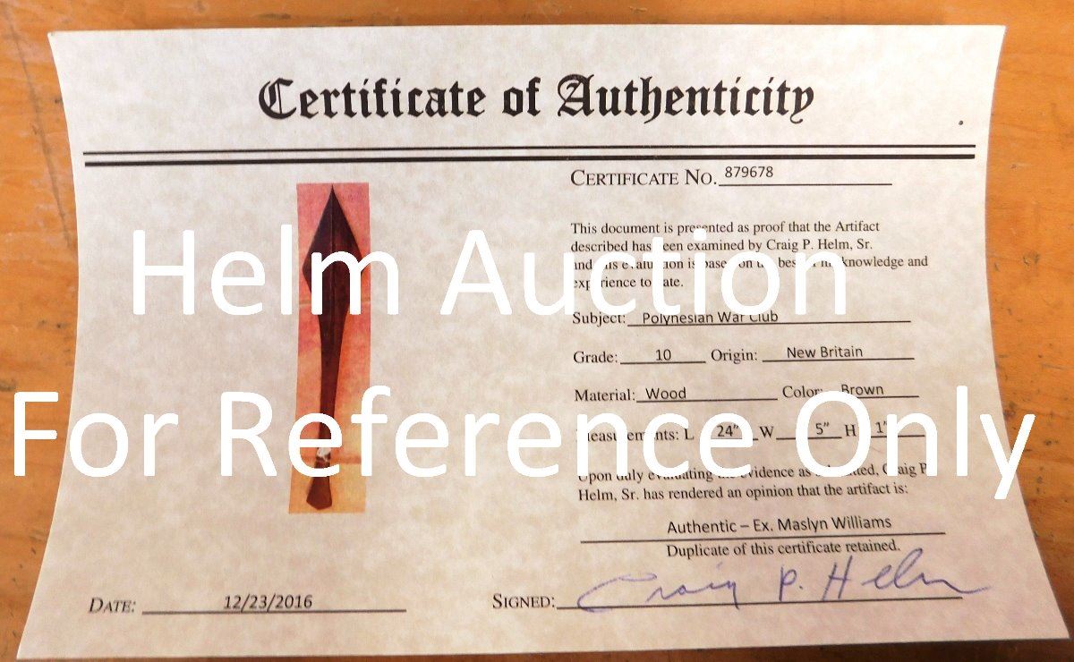 Polynesian War Club, circa WWII. Made of ebony-like hardwood, the item is 24" x 5" x 1". New Britain. Unusual striking surface.Ex. Maslyn Williams, author of Stone Age Island. Helm Certificate of Authenticity. Condition: Nice, see images. Shipping: $30.00, due to length, w/insurance and signature.