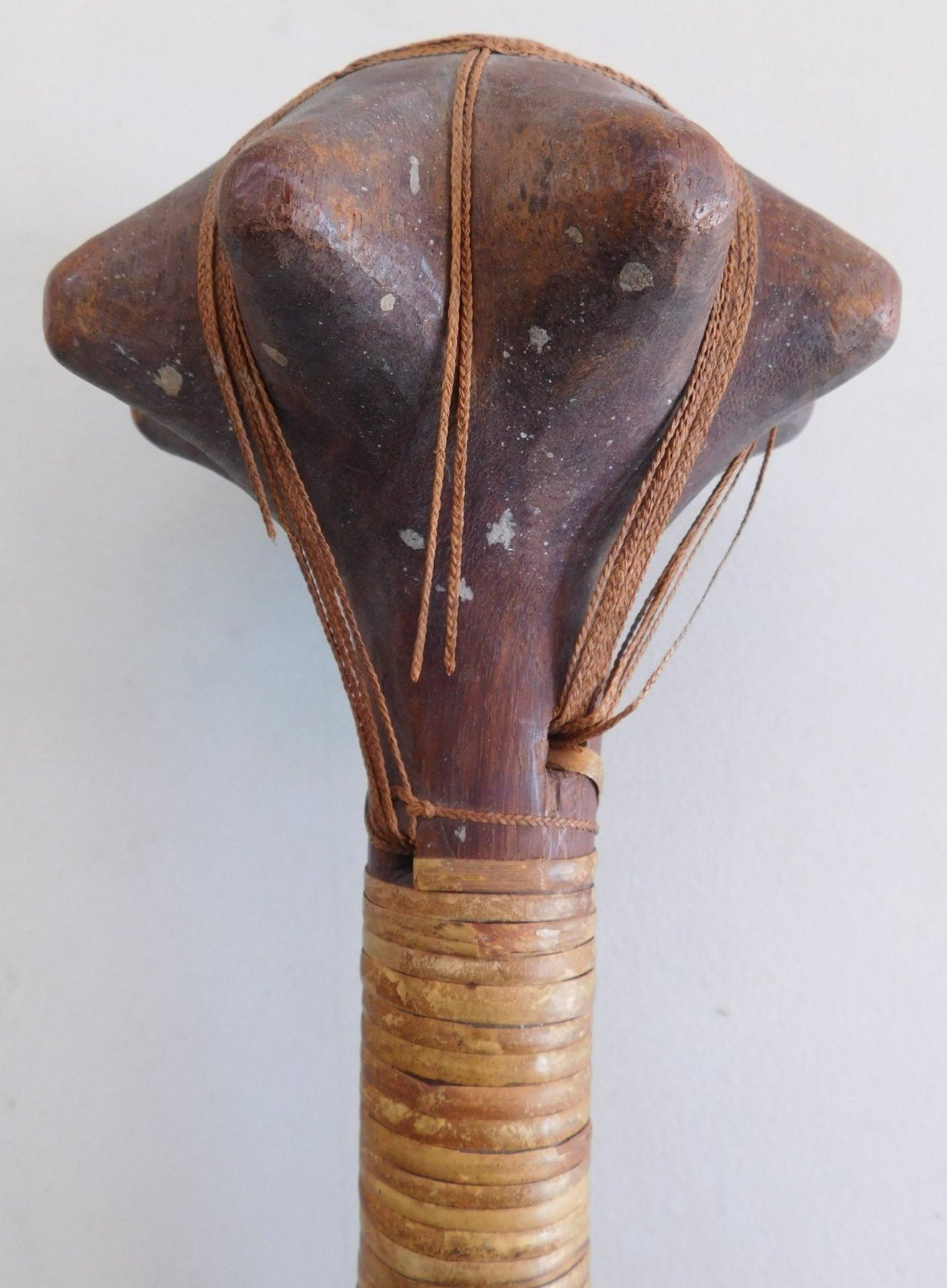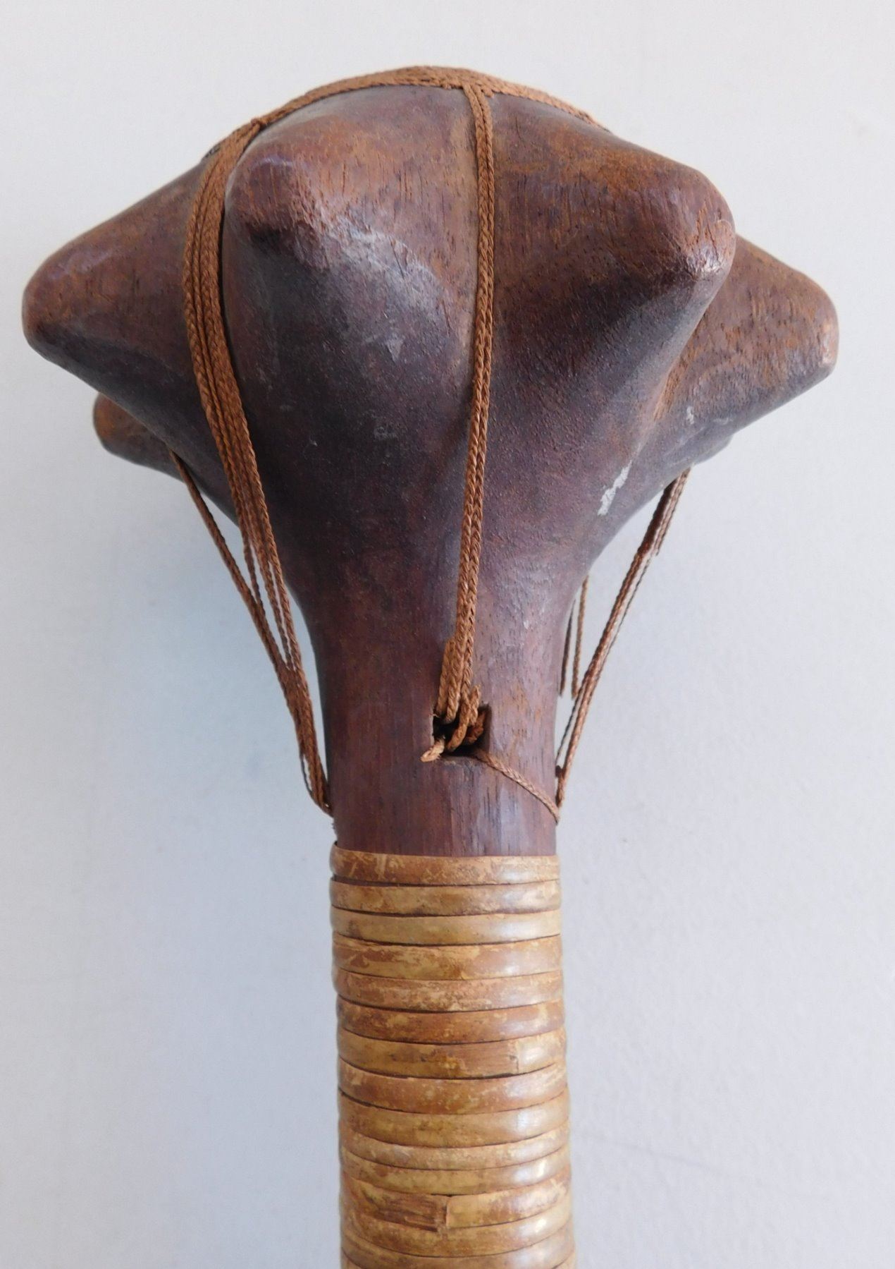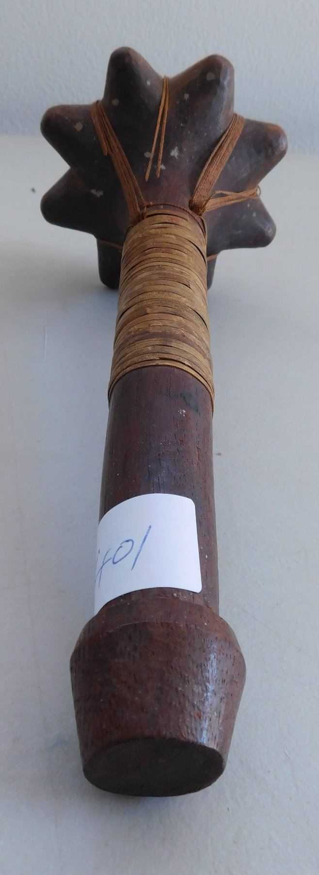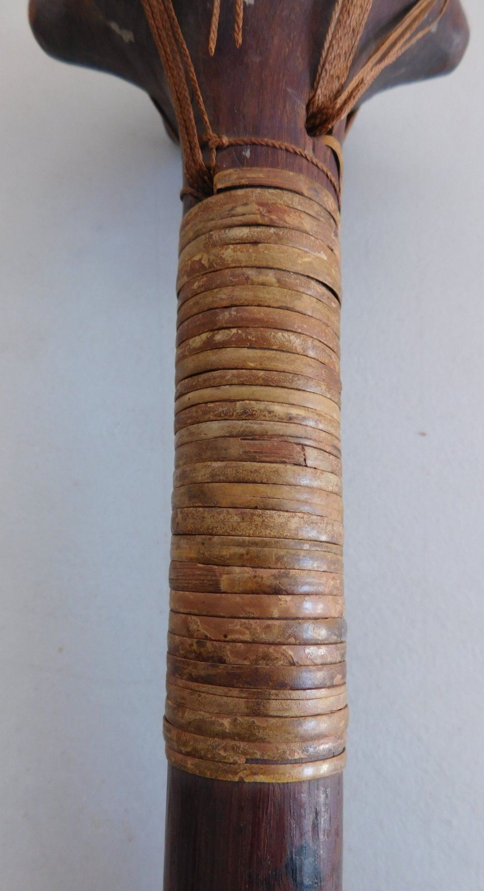 Polynesian War Club w/Helm COA, circa 1850s. This 19th century war club is made of wood and senet, measuring 4.5" x 4.5" x 13". Rennell Island, Solomon Islands. Helm Certificate of Authenticity. Condition: Some wear, some cordage broken, see images. Shipping: $45.00 w/insurance and signature, due to value.