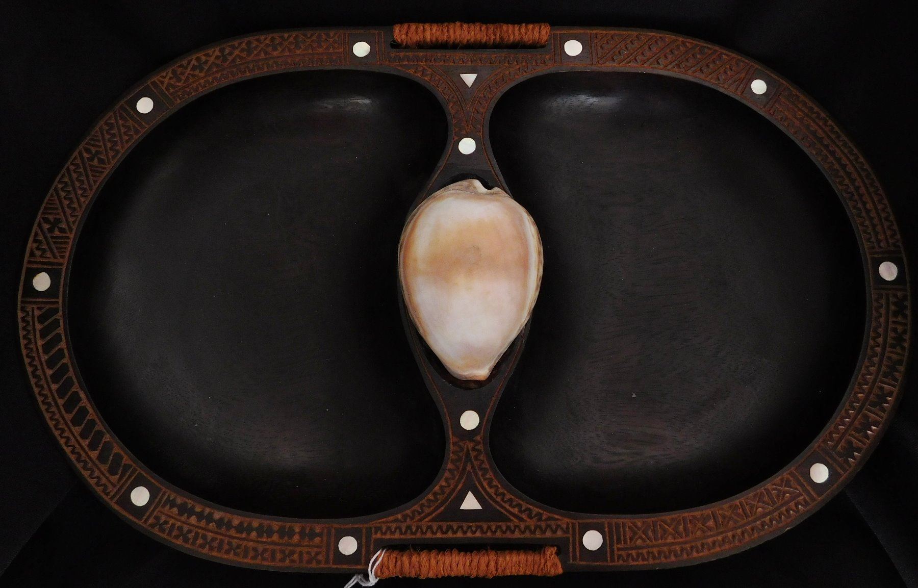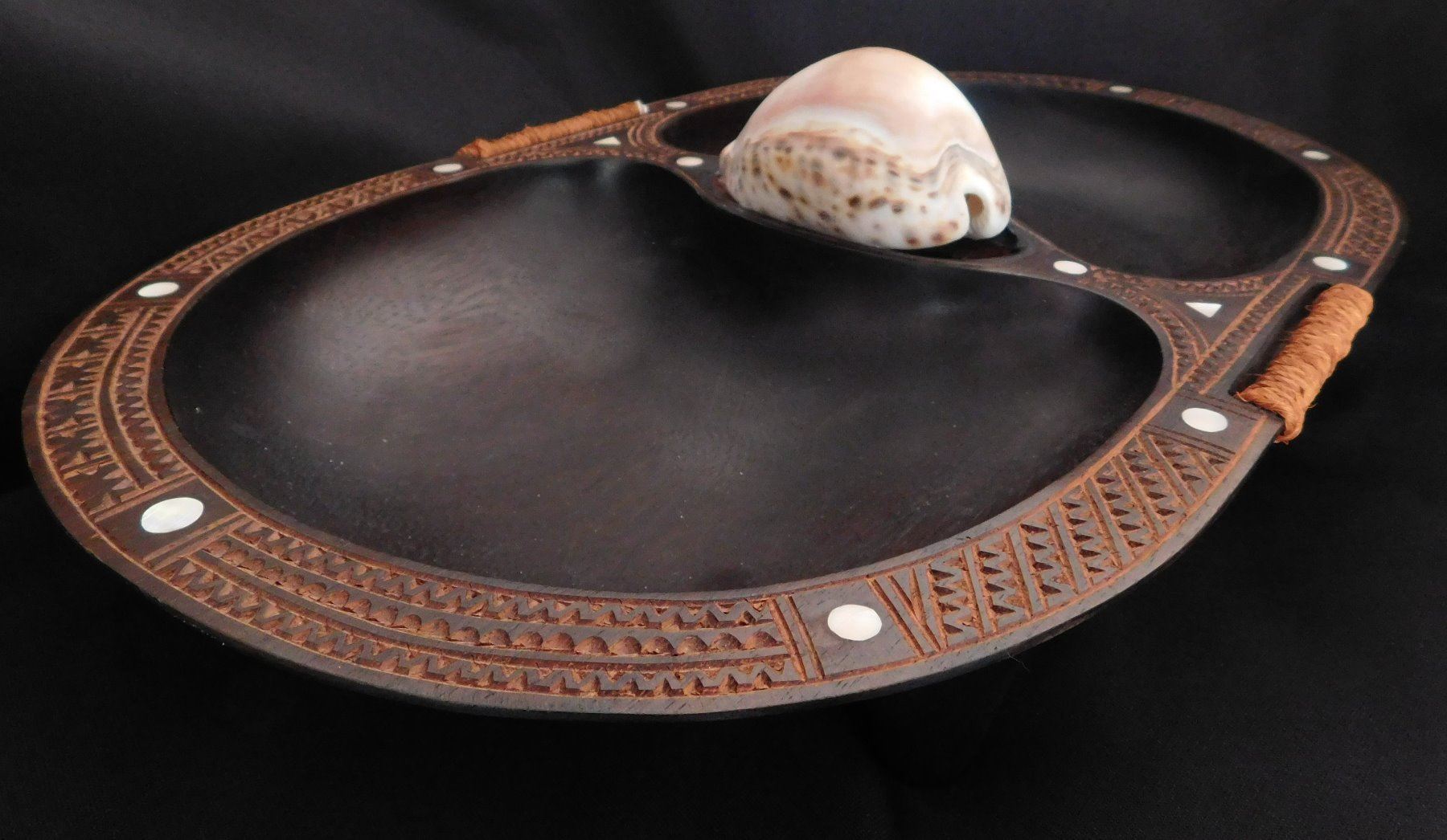Polynesian Wood Bowl w/Shell, circa 1960s. Made of wood, shell and lashing and mother of pearl inlay, the item measures 16" x 10" x 2.5". Trobriand Island. Shelly inlay, fine carving, senet wrapping. Sold recently for $300.00. Condition: Good, see images. Shipping: $28.50 w/insurance and signature, due to size.