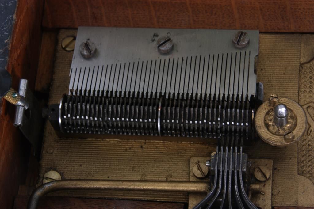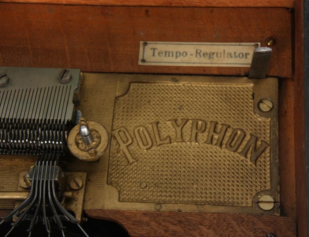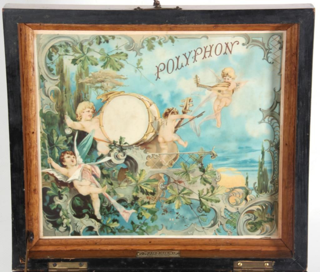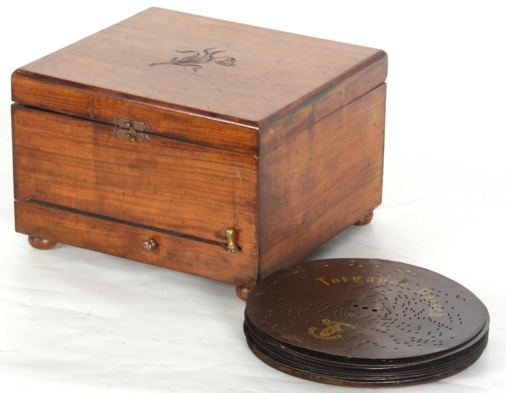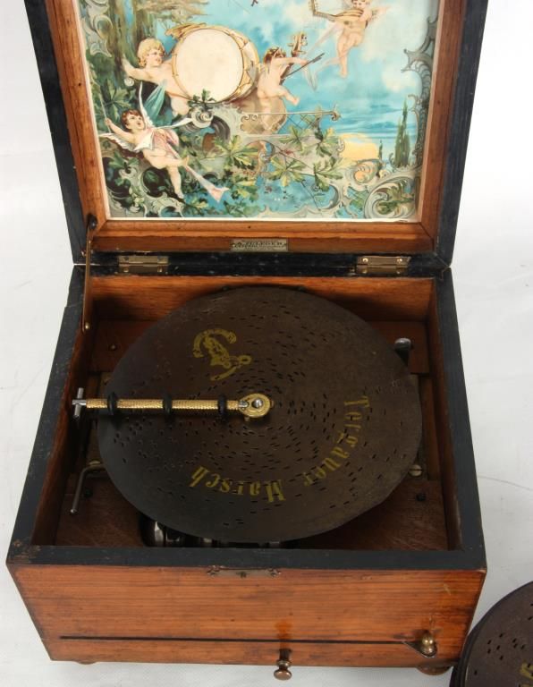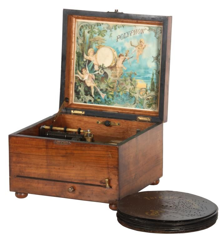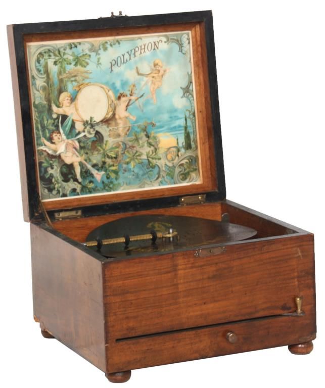 Polyphon Disc Music & Bell Box. Mahogany case has a carved flower in the lid and stands on turned feet; brass lever ratchet crank mechanism in the front of the box with start-stop knob below. The interior has a gilt finished base plate stamped “Polyphon”, knurled gilt brass idler arm with 8 in. discs playing on a single comb and a nest of 6 steel bells; Polyphon chromolitho under the lid with musical cherubs and retailers tag for “Musikenstumente, A. Zuleger, Leipsiz”. Nice playing box, in good running condition with nice sound, has 12 discs. 7 in. high x 10.5 in. wide x 9.5 in. deep.