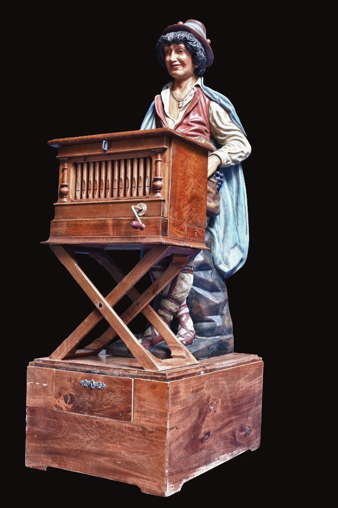 Polyphon Savoyard. Sehr schöner Automat Model 100 mit 28cm Plattenspielwerk. Die in Holz geschnitzte Figur dreht die Kurbel der Drehorgel und das Musikwerk spielt eine Melodie. Museumsqualität. Mit 5 Platten à Ø28cm. 60 x 70 x 150cm. Hersteller unbekannt,, Musikwerk von Polyphon, Germany, circa 1900/1995.