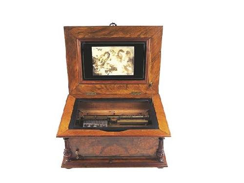 Mechanical, scanner disk, arm-winding, spring-mechanism. Old-German style, walnut veneered wooden box, cast, brass mounting. On the top there are songbirds among branches. In the inner part there is a photo of angels playing music on a glass plate. It is in working condition, with 50 steel-disks. German, late 19th century. Size: 37.5 x 49.5 x 22 cm Disk diameter: 30 cm
