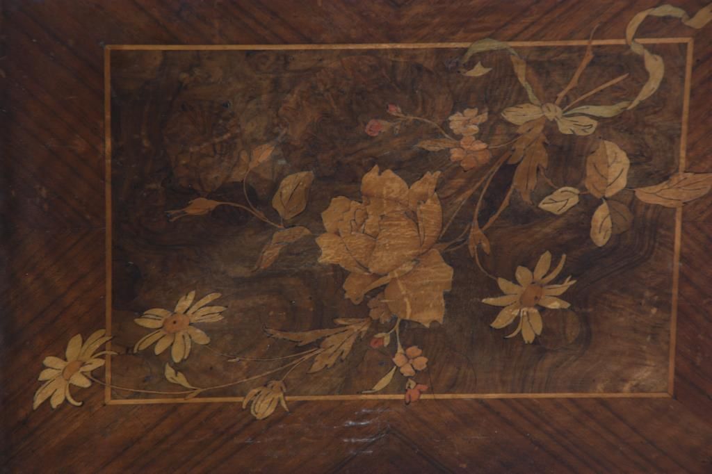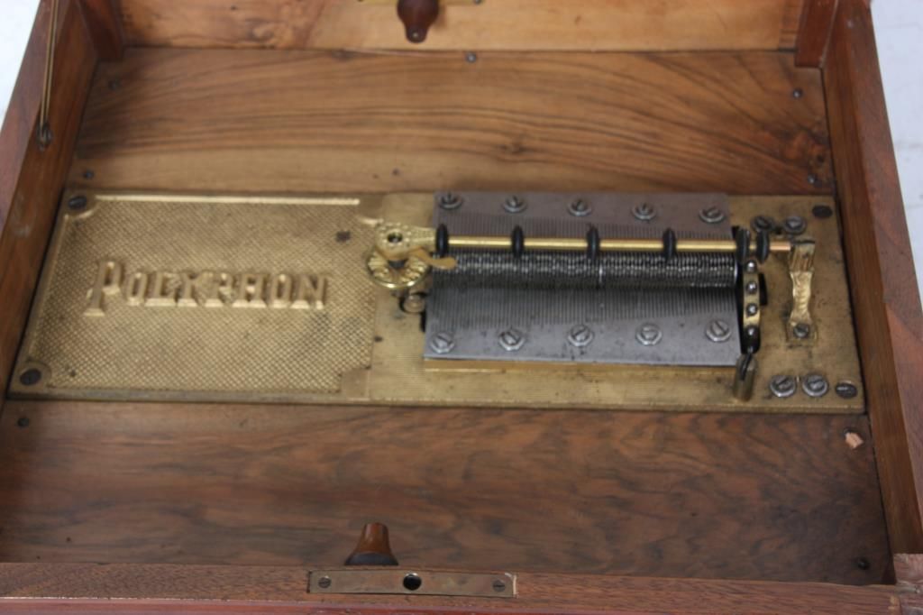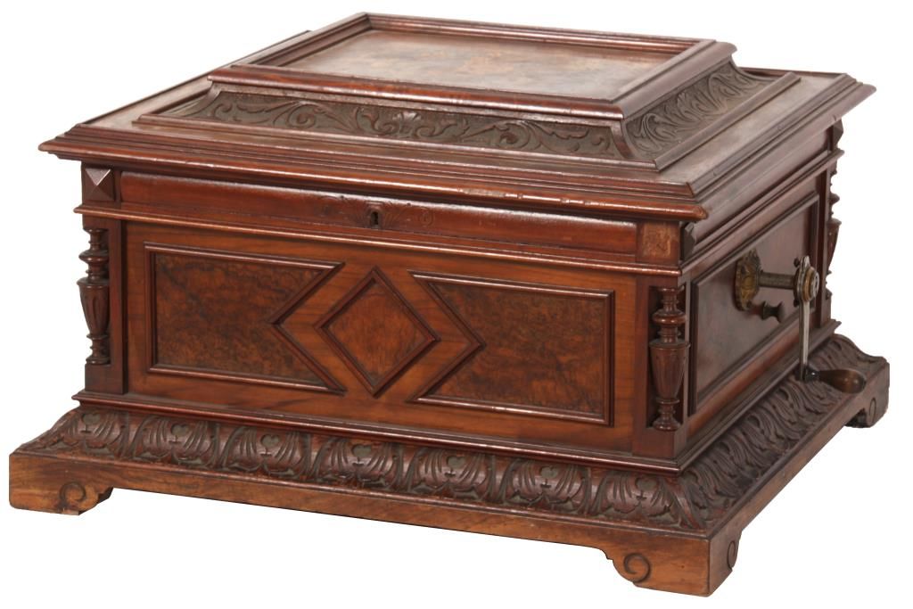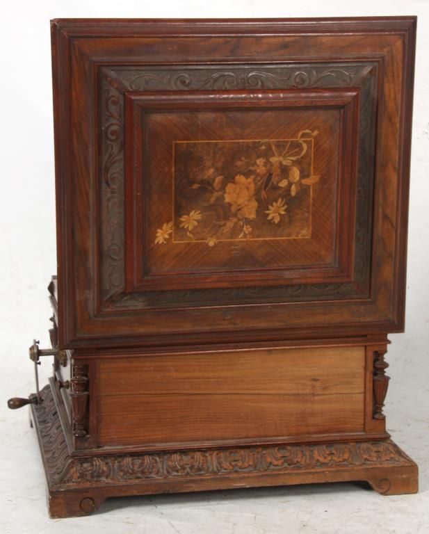 Polyphone Inlaid Music Box. Carved walnut case with scroll carved border on the lid and a centered inlaid panel with roses and various flowers; the case has turned spindles on the corners, wood trim borders and a leaf carved border above the feet. Double comb, spring driven mechanism, signed Polyphone, plays a 15 in. disk. In very good original finish, good condition, no broken teeth, 21 discs. 13 in. high x 23 in. wide x 21 in. deep.