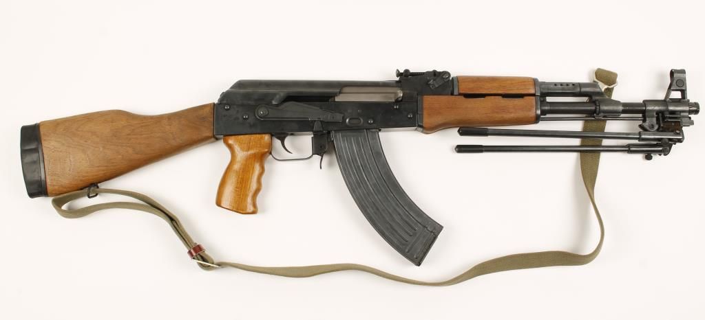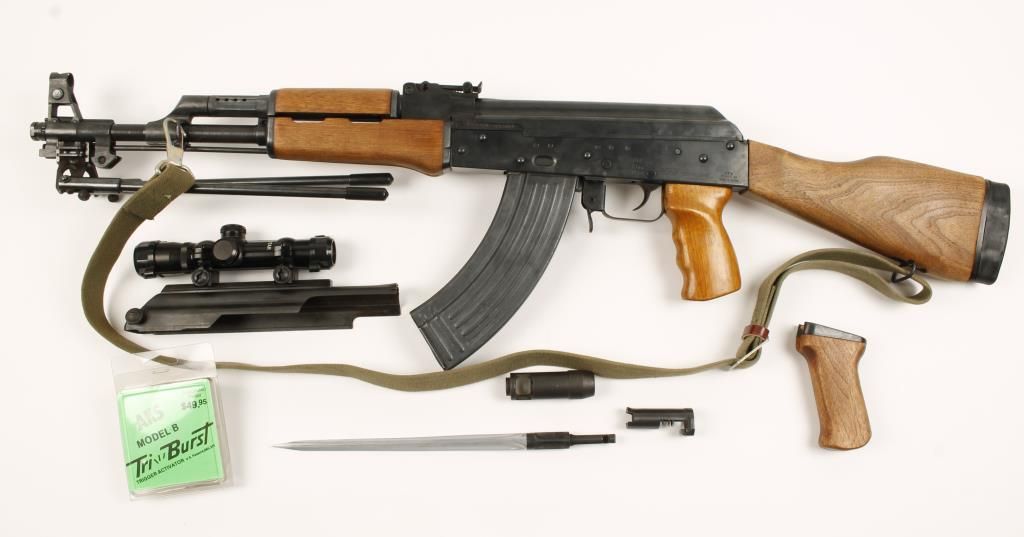 Semi automatic rifle with a 16.1" barrel. Wood furniture and a bipod. Includes bag with bayonet, extra cover with Red Star 4X20 scope, Tri-Burst trigger activator, AK 1" stock extension, flash hider, original pistol grip and one 30-round magazine. Condition is good plus. *Modern Firearm*