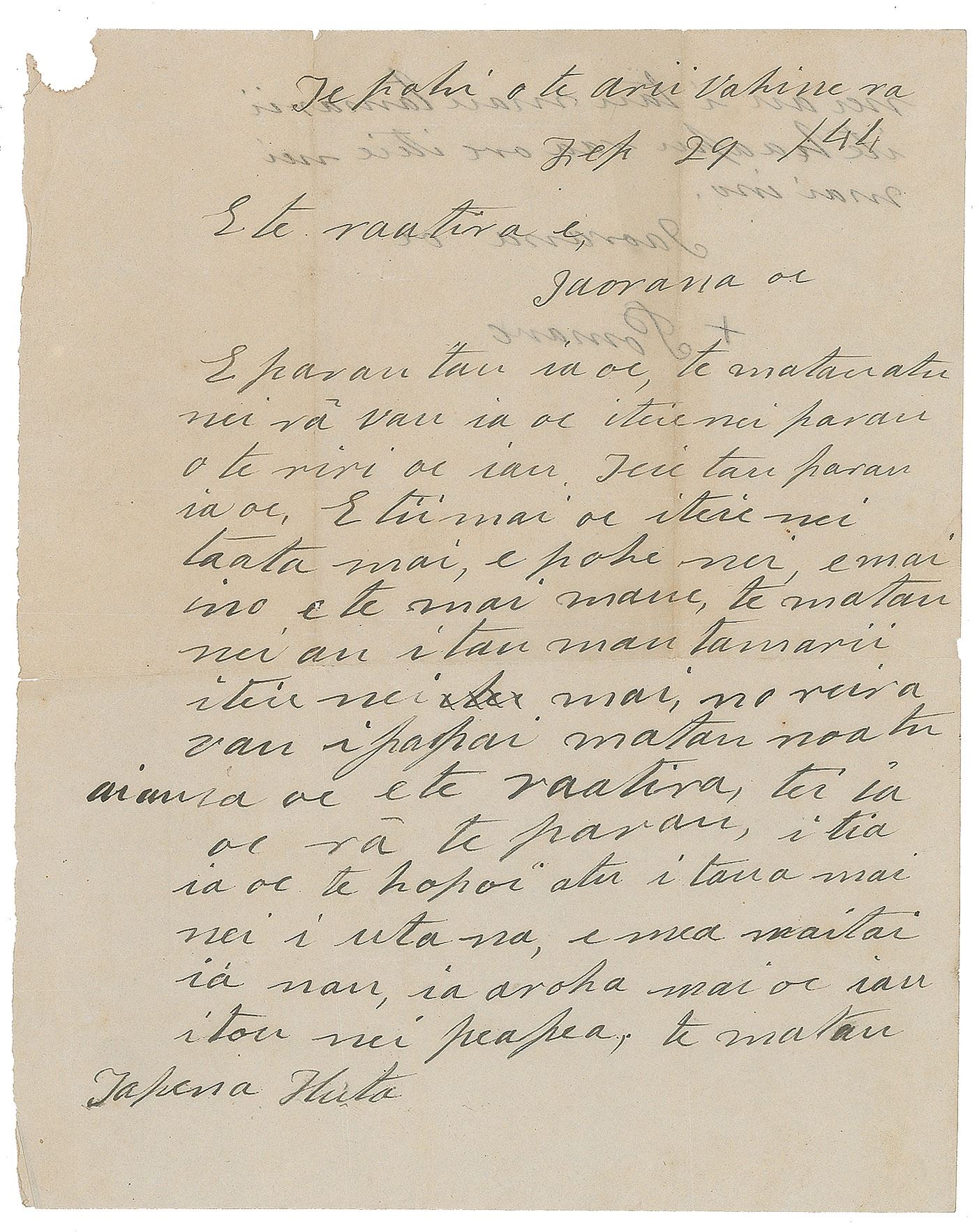 Queen of Tahiti (born 1813) from 1827 until her death in 1877; she succeeded as ruler of Tahiti after the death of her brother Pomare III when she was only 14 years old. ALS in Tahitian, signed “Pomare,” one page both sides, 8 x 10, February 29, 1844. Letter to "Captain Hunt," in part: "I have a word for you, but I am much afraid lest you should be angry with this word. It is this; come and take this sick man on shore, he has a bad disease and it is infectious. I am alarmed for my children, on that account I write with some degree of fear to you O Captain. But it is for you to decide." In very good to fine condition, with a small semicircle of paper loss to the upper left corner. Accompanied by a contemporary manuscript translation.