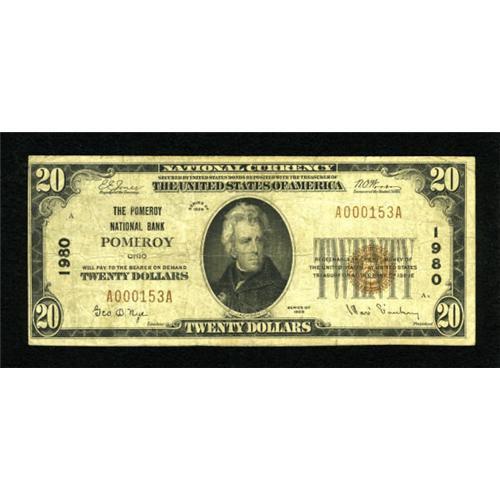 <B>Pomeroy, OH</B></I> - $20 1929 Ty. 1 <B>The Pomeroy NB</B></I> Ch. # 1980<BR> Only about two dozen small size pieces are known extant from this Meigs County issuer. <B>Very Good.</B></I><BR><BR><b>Shipping:</b> Coins & Currency (<a target="_blank" href="http://www.heritageauctions.com/common/shipping.php">view shipping information</a>)