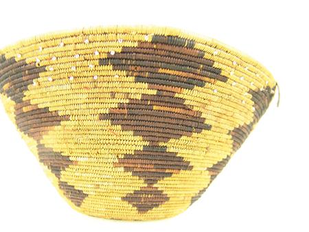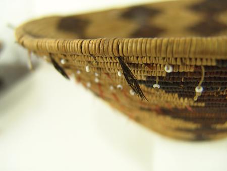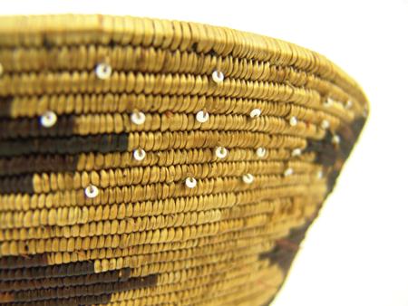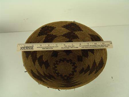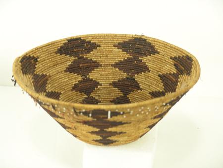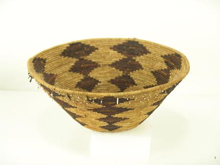 Circa 1900, Exceptional widely flared bowl with stacked diamonds and tiny white seed bead accents. Very good condition. Ex: Frank Curley collection. 4-1/2" x 10-1/2"