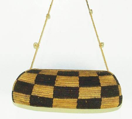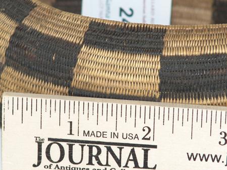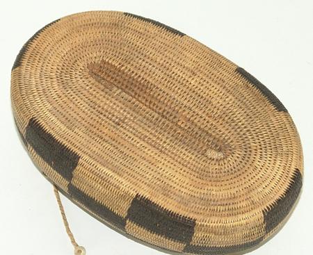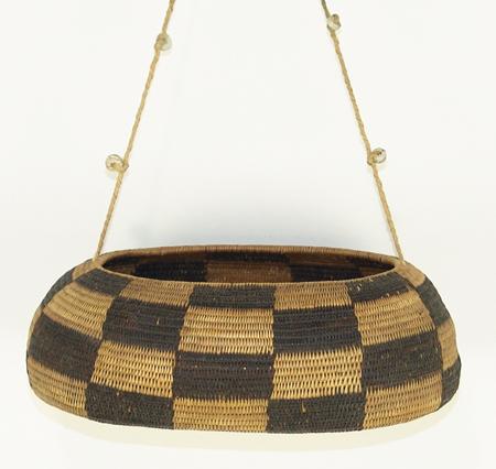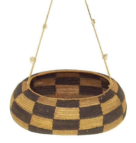 Circa 1900, Beautiful extra fine weave oval shaped single rod "boat basket" with checkered design and hanging string. Very good condition. 2" x 3-3/4" x 5-3/4" From the Johnson Collection.