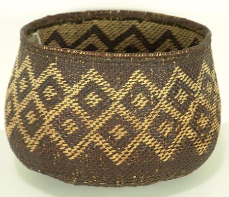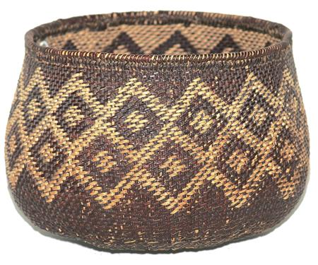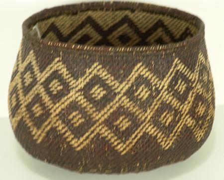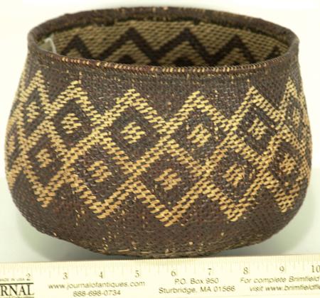 Circa Early 1900s, Beautiful woven deep basketry bowl with slightly flared rim, rounded bottom, and fine concentric diamond design done in reverse. Very good condition. 6-1/2" x 8" From the Johnson Collection.
