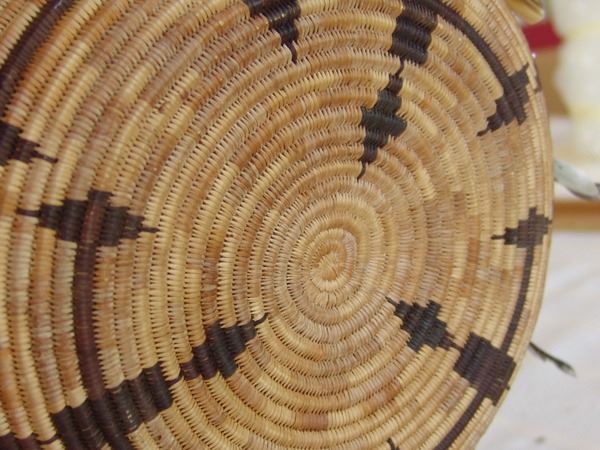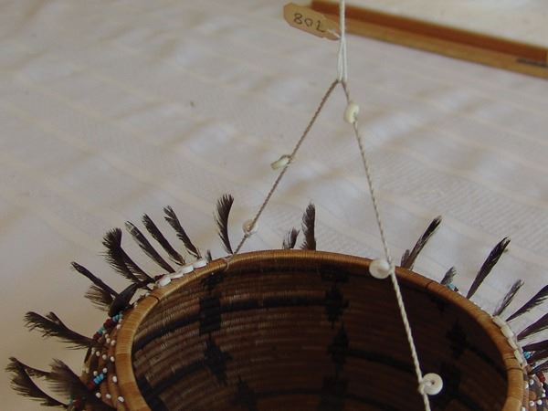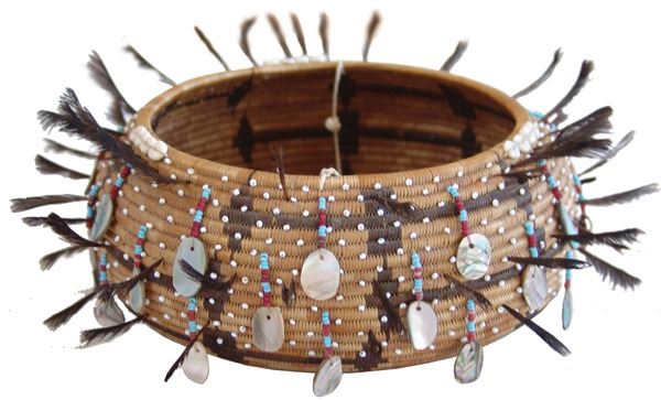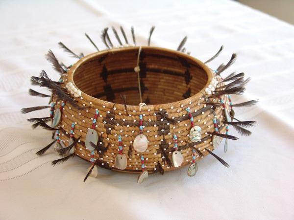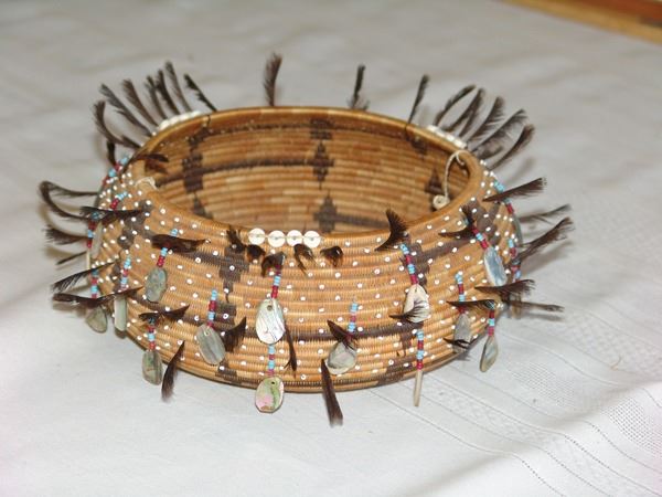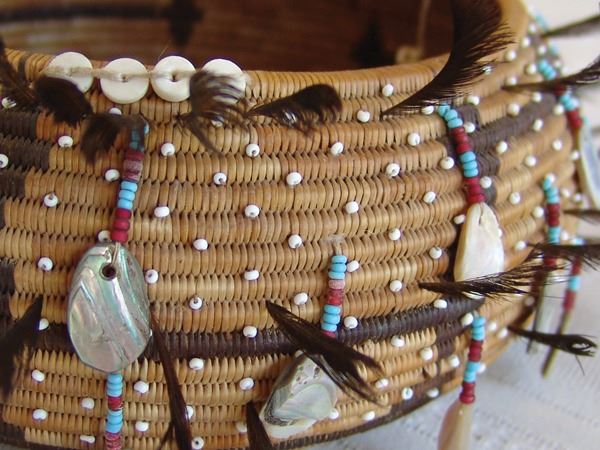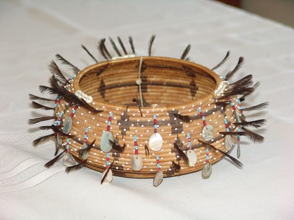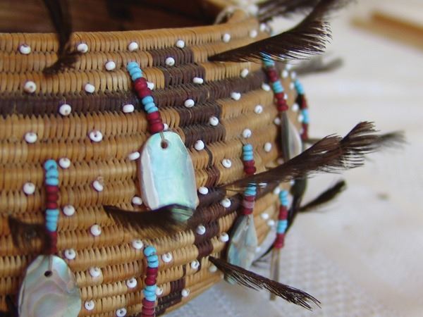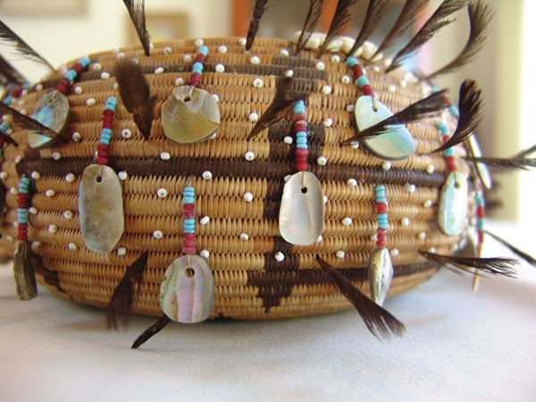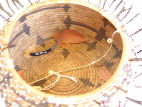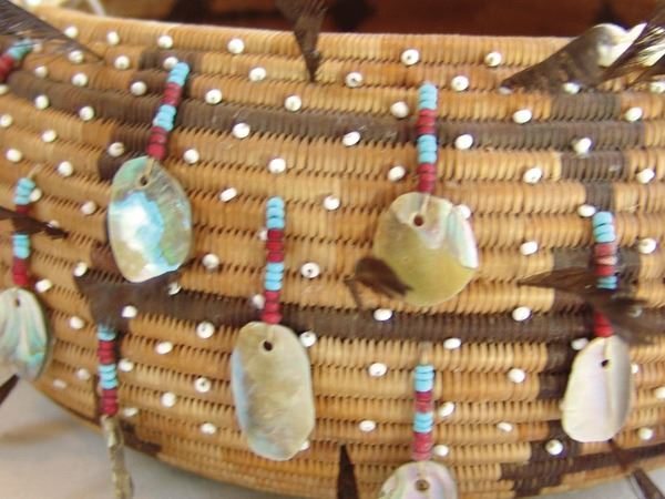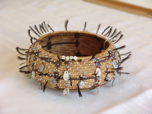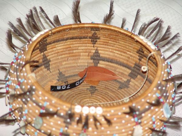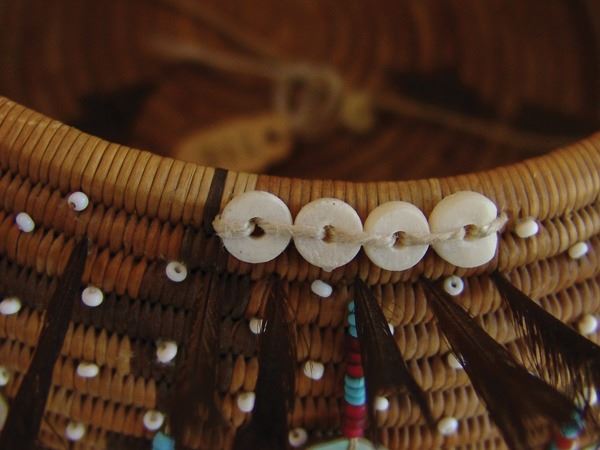 Fantastic, extra fine weave rounded basketry bowl with arrow/bar design, the exterior decorated with blue and white heart Czech seed beads, carved shell discs and paddles and most, if not all, of the original quail top knot feather still in place. Also with original string handle. Excellent condition. Ex. Mark Wald collection. *This was Mark's prized possession!