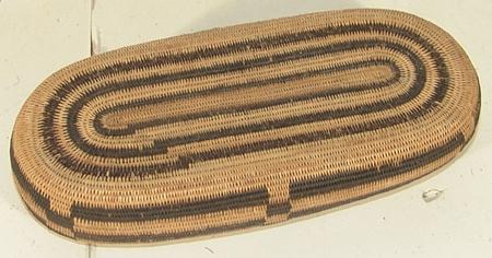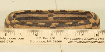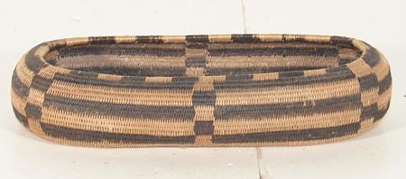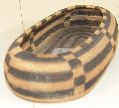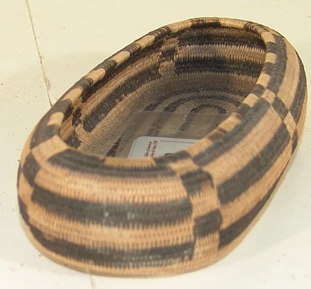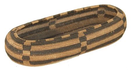 Very tightly woven small boat shaped basket with light and dark lines on the bottom and sides. 1-1/2" x 6-1/2"