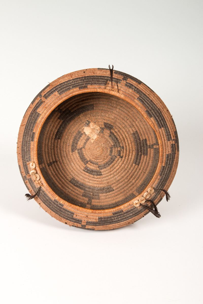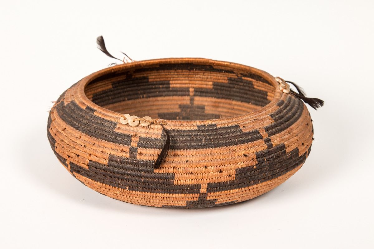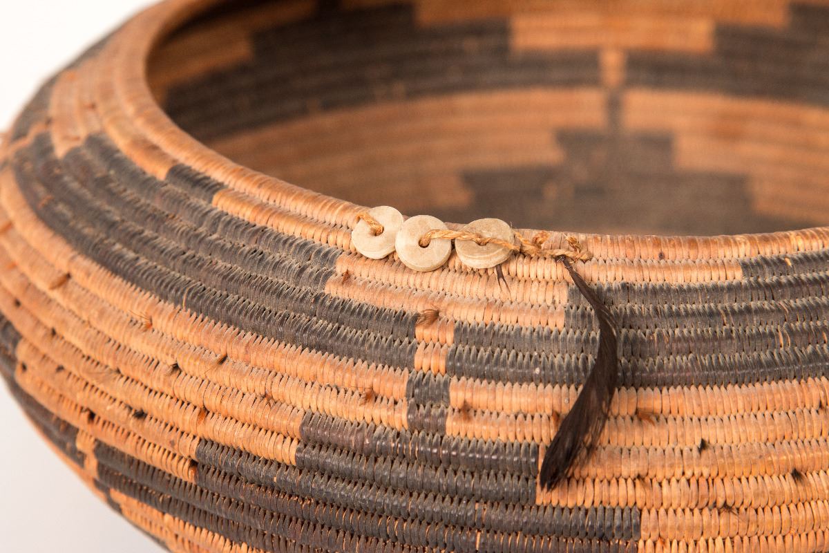Pomo Coiled Gift Basket. 3" x 7 ¾". Finely woven with some quail topknot and shell decorations remaining. Circa 1900.