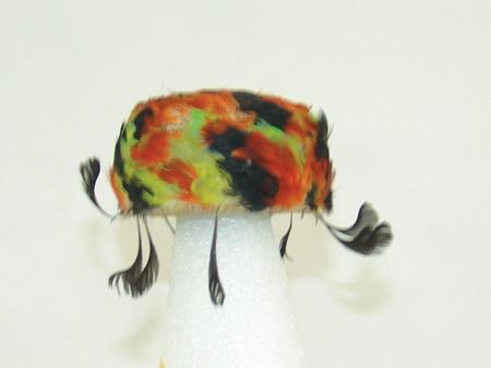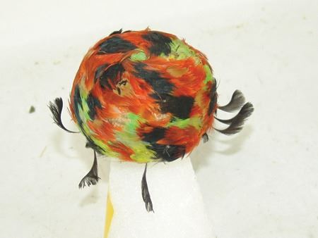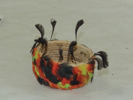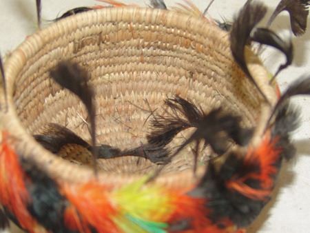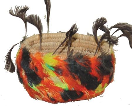 Ca. 1930s, A colorful fine weave bowl, the exterior fully covered with feathers and with the traditional top knots protruding from the rim. Good condition. A few top knots missing/damaged. 2" x 2-3/4"