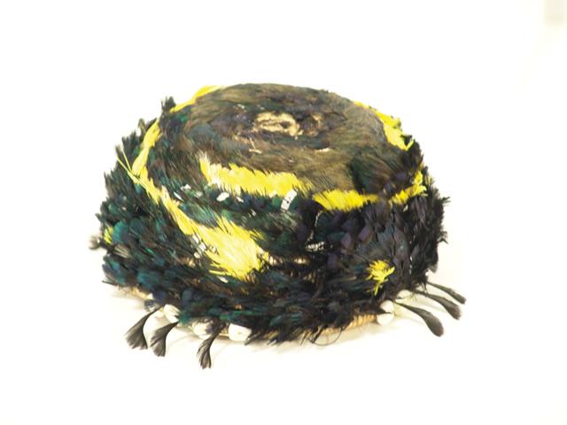 Circa 1950s, Rose Anderson, Large and rare 3-rod woven coiled bowl with shell bead accents, quail plumes, and almost all of its original woven-in feathers; very good condition. 3" x 5-1/2"