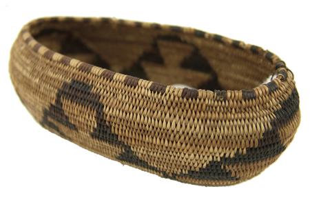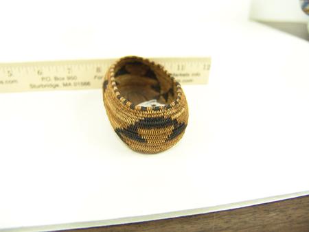 Circa 1900, Rare oval shaped extra fine weave basket with stepped triangle motif. Very good condition. Ex: Frank Curley collection. 1-1/4" x 4" x 2-1/2"