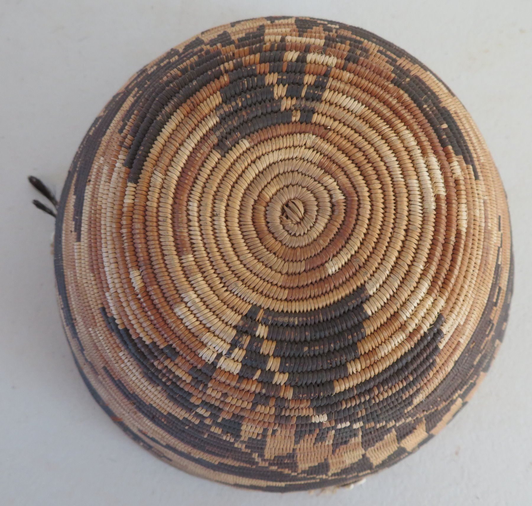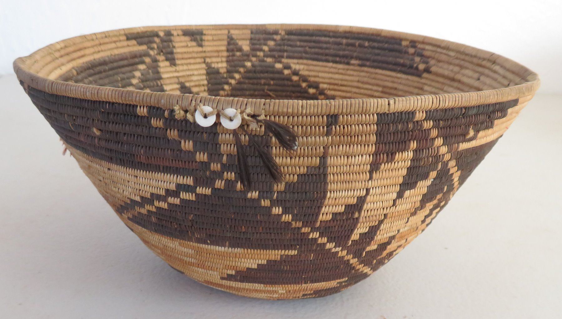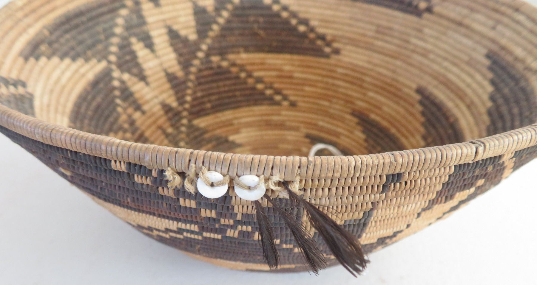 Pomo Treasure Basket, c. 1900. Made of grass and shell, the item measures 8" x 4 1/2". San Francisco County, California. Condition: Good, fine weave, see images. Shipping: $40.00 w/insurance and signature, due to value.