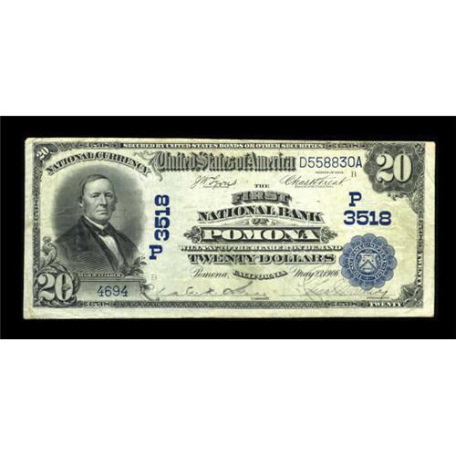 <B>Pomona, CA</B></I> - $20 1902 Date Back Fr. 643 <B>The First NB</B></I> Ch. # (P)3518<BR> An attractive piece from this well collected Los Angles County location. This example, from the Kansas City collection, is the only $20 Date Back in the census from Pomona. Pleasing <B>Fine-Very Fine.</B></I><BR><I>From The Kansas City Collection.</B></I><BR><BR><b>Shipping:</b> Coins & Currency (<a target="_blank" href="http://www.heritageauctions.com/common/shipping.php">view shipping information</a>)